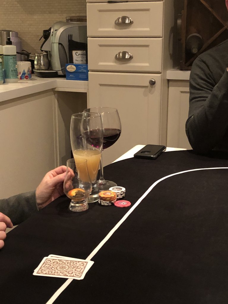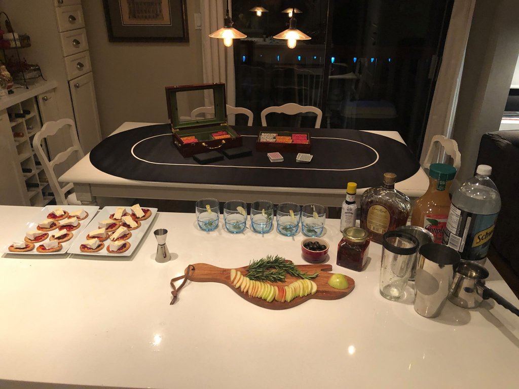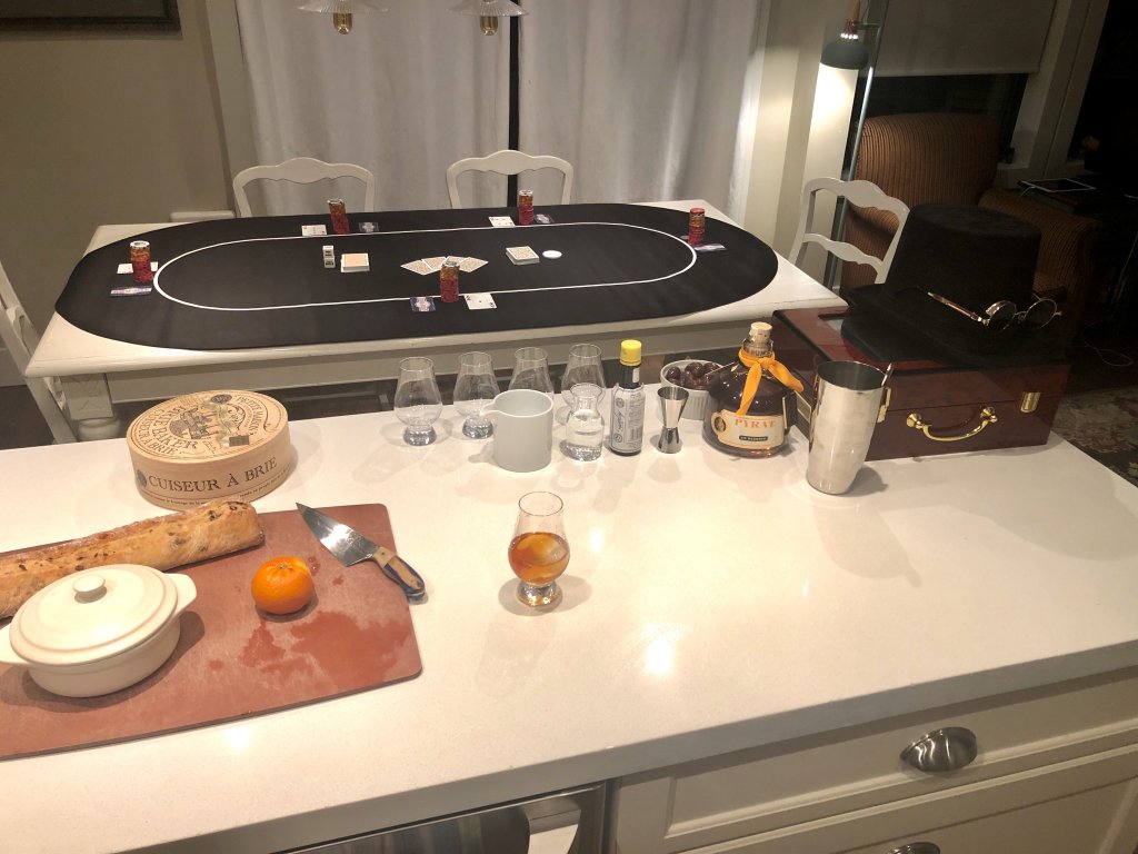 Last nights game. Low stakes cash with my regulars. Drink was a Pyrat Rum old fashioned, baked Brie (sorry @Hornet) and bread for snacks.