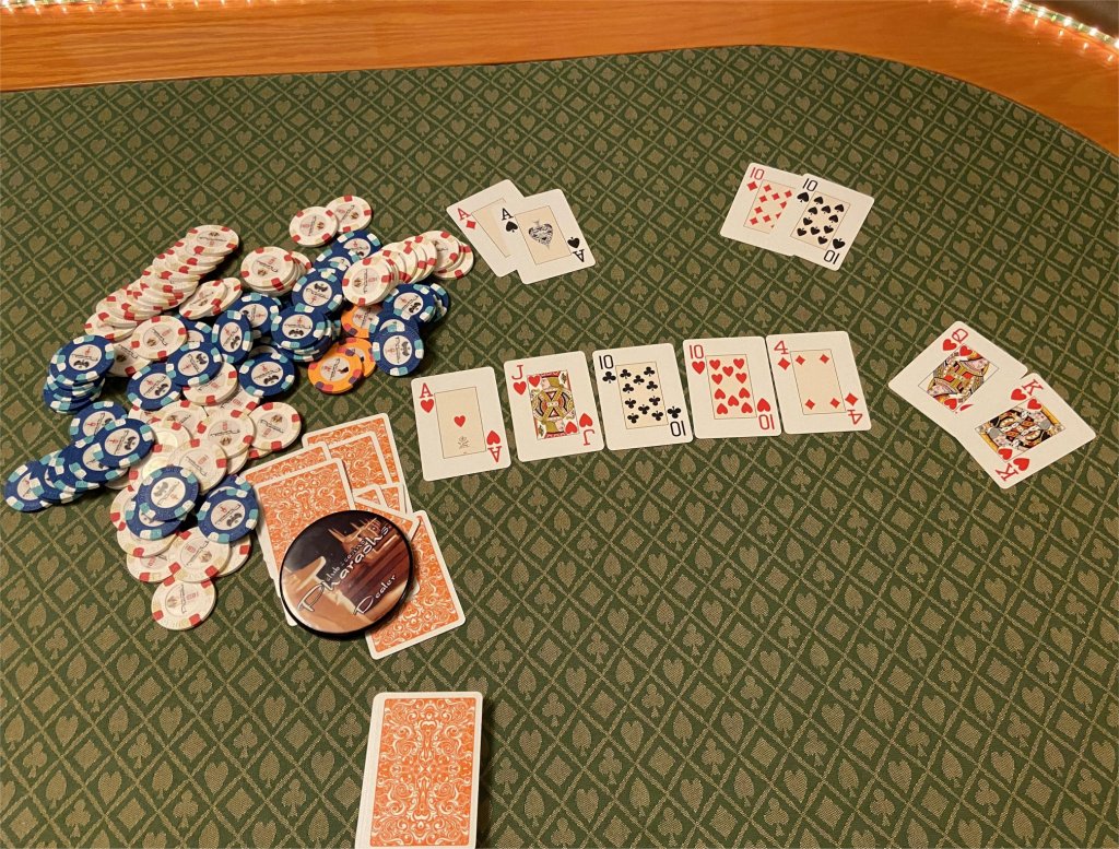 A few years ago we had a straight flush over quads in my cash game, but no boat. Two out of three ain’t bad!
