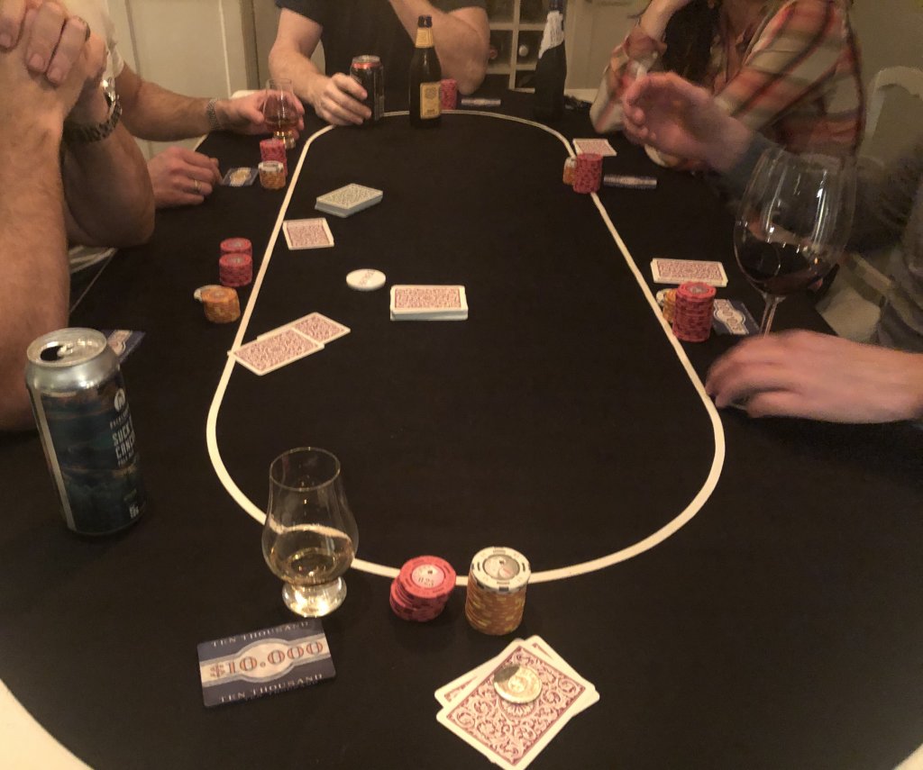 This is a pretty typical poker night at the Camino Casino (with people I might add ;)). We run a 6 handed cash game, I try to provide some snacks, a drink of the night (usually involving Whiskey) and we play a pretty loose .25/.50 game. I run the table most nights, but it basically only pays for the cost of hosting. It's a great social night and it's gone from bi-weekly to weekly.