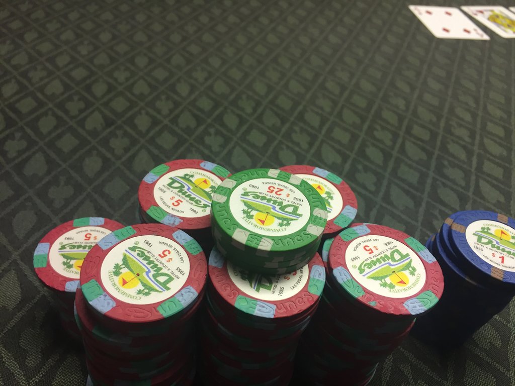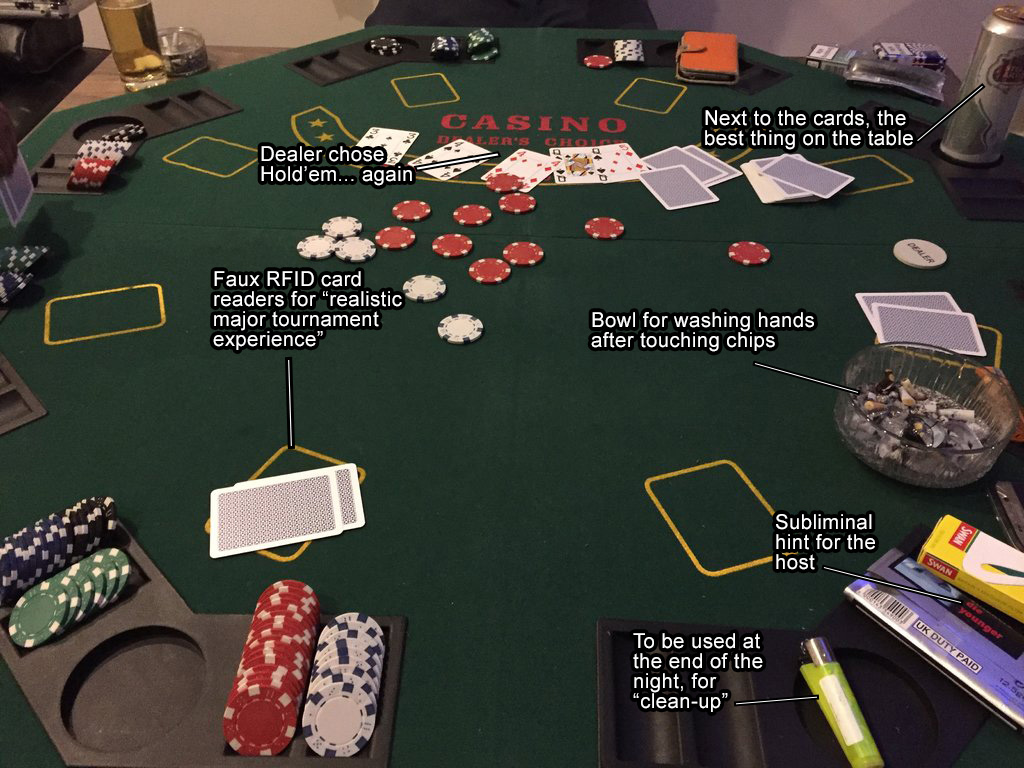 At a home game (not hosted my me) Had to deal with dice chips and a fold out table, at least I brought my copag plastic cards!