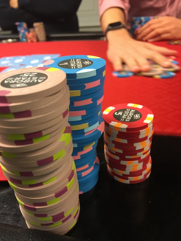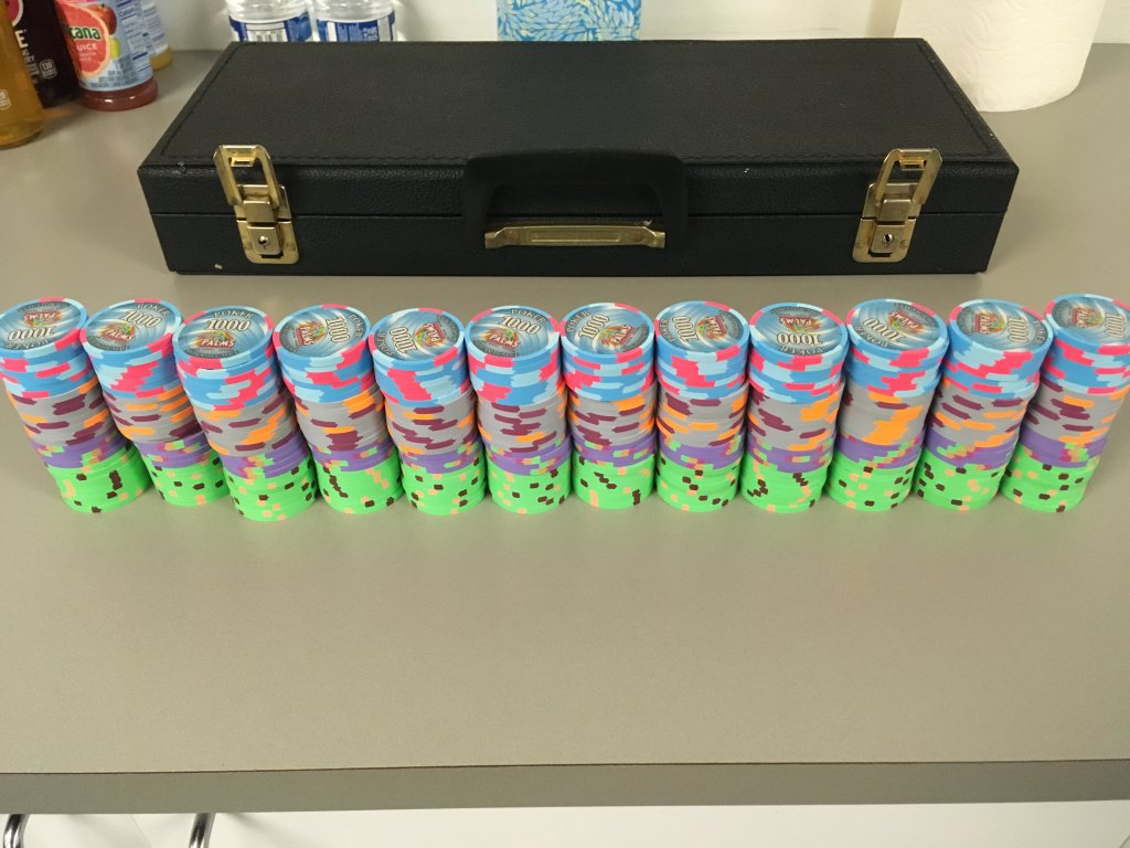 Man.... look at those awesome starting stacks!!!!! Wow!! Still by far my favorite Tourney chips!!! Congratulations on getting them in play! I hope everyone in your group were chippers!!T10K tourney, in for two $20 bullets, out in 3rd for a $20 profit
