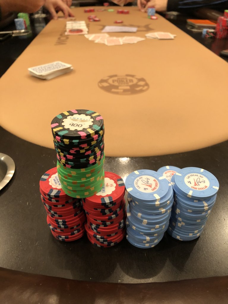Nice win! Looking at the picture without zooming in to see denominations I would have guessed yellow 25c, blue $1, red $5 by edge spot (or lack of) progression. Strange that the $5 is the least complex spot of the 3.