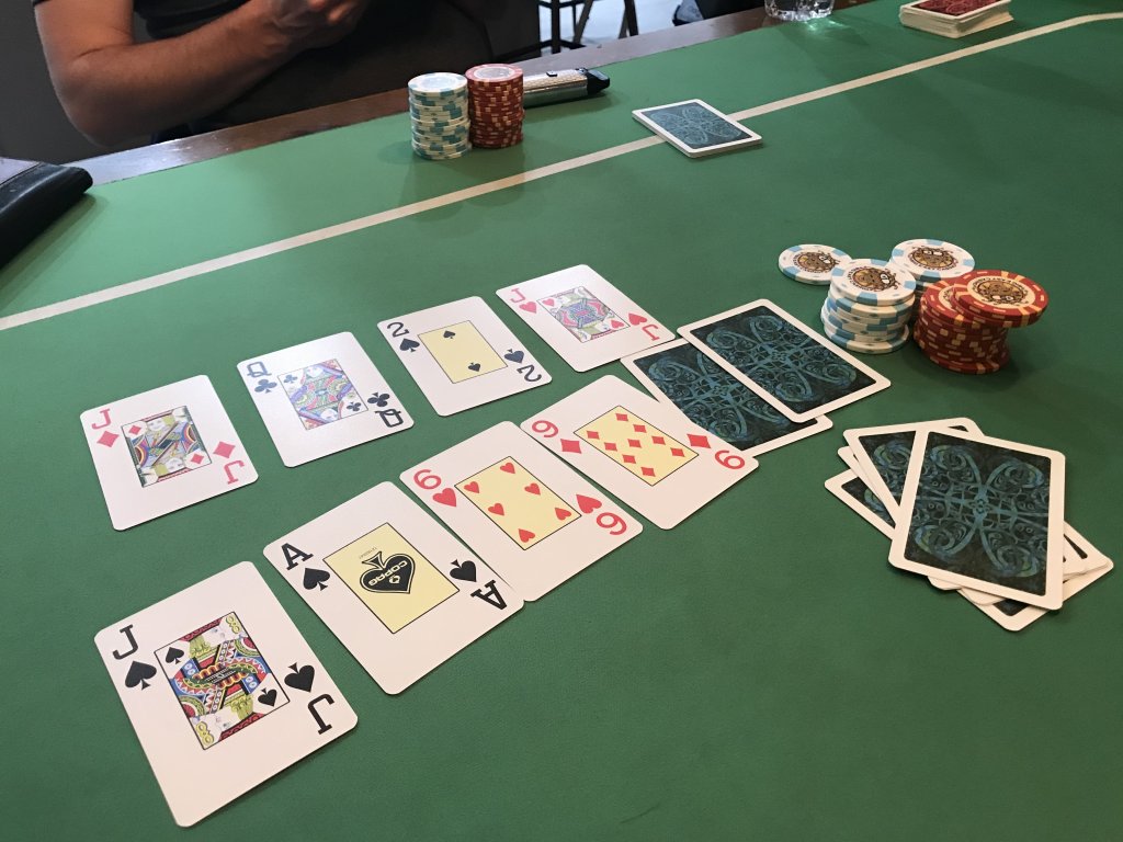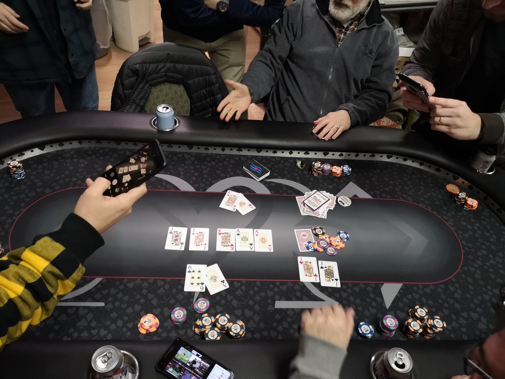 Already posted but an insane hand about halfway through the night. AK and JJ all in, (A6 folded preflop but showed their hand). Right to left, AAK board, then runner runner Jacks for quads. Very appropriate since our club is called the Runner Runner Club.