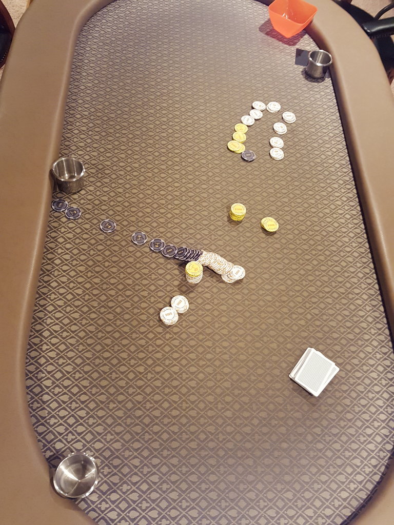 Morning after tournament and cash game tables. I've corrupted this group from 5 dollar hold em only cash games to 40 dollar buy ins and sohe. That is what I call progress.