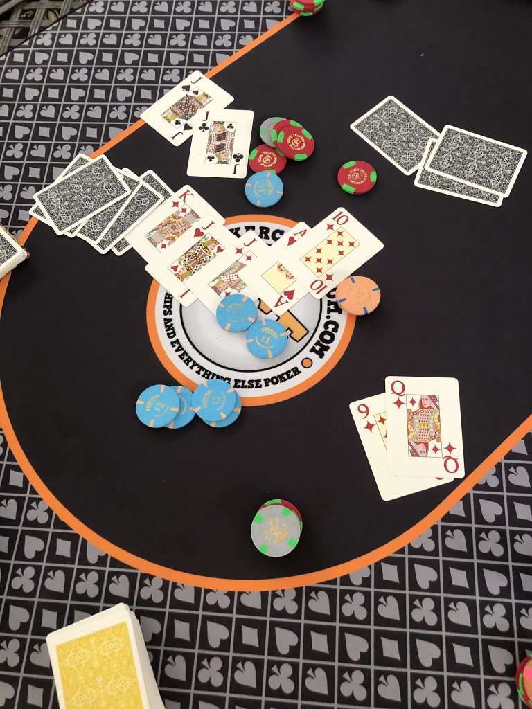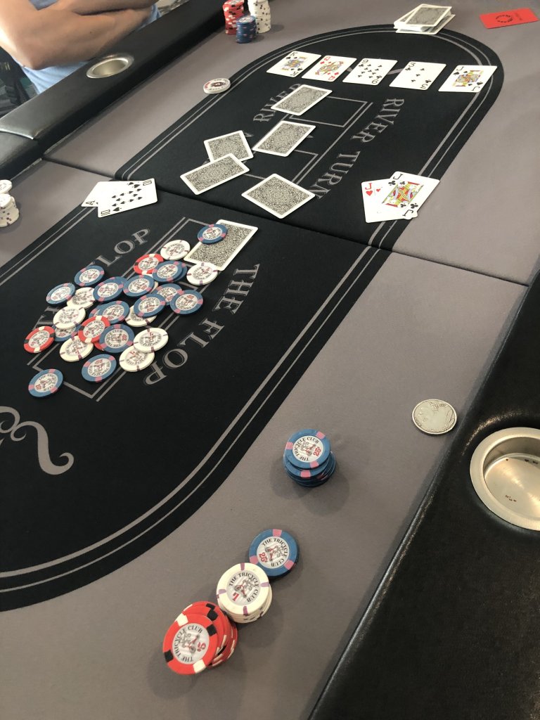 In this next one, Ben flopped quad jacks and kindly slow played it so I could catch up and make my straight flush.What a guy!