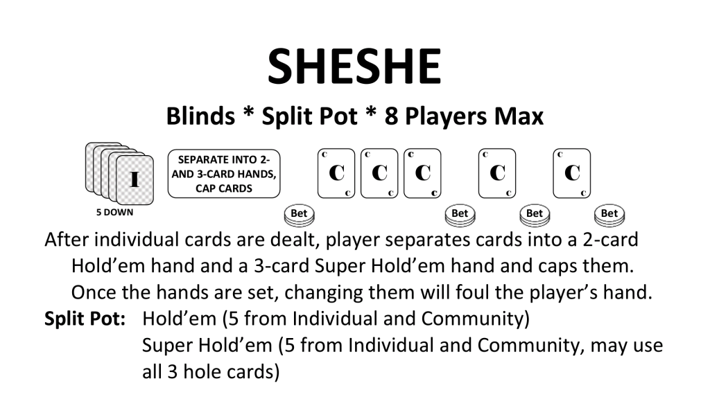 Also, SHESHE - Simultaneous Hold'Em and Super Hold'Em. 5 cards split preflop into a 2 card Hold'Em hand and a 3 card Super Hold'Em hand.