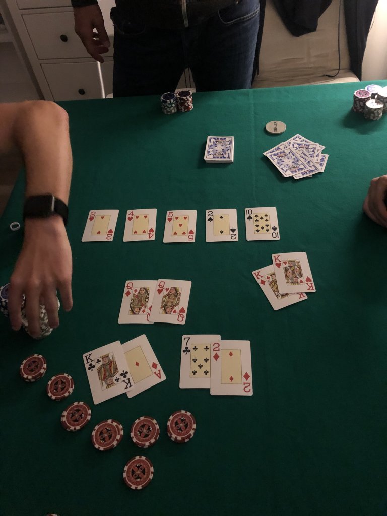 All turned them over and.... of course, 7-2 took it down with KK collecting a very nice side pot. Fun times.