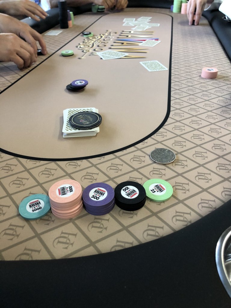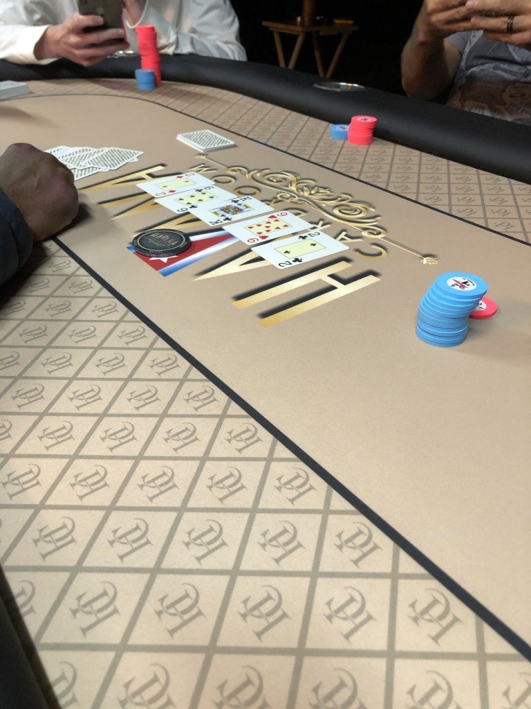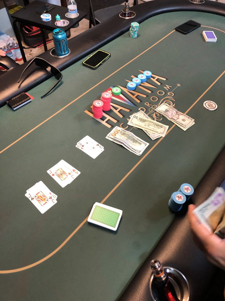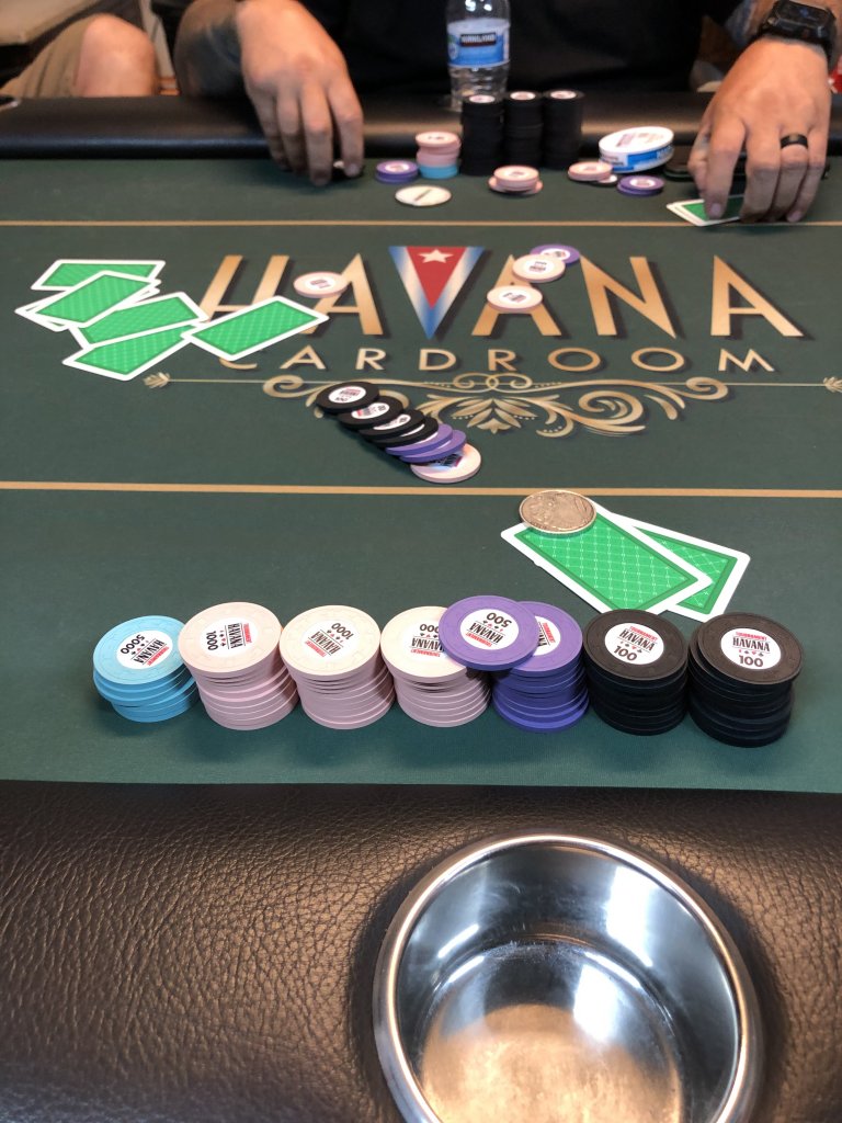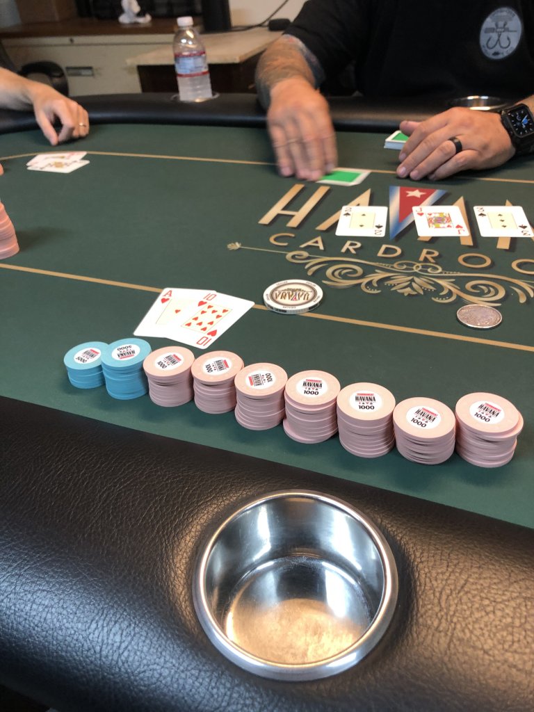 League night at the Havana Cardroom. Early at the final table, I shoved AK into @whitemamba1646’s flopped set of nines. But I luckboxed a runner runner flush to double up and prevent his threepeat.