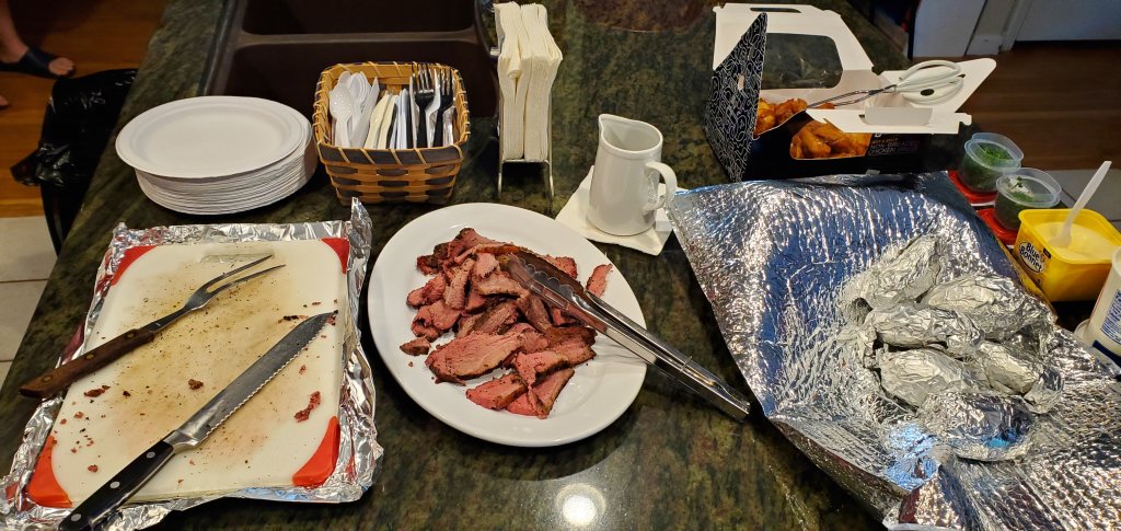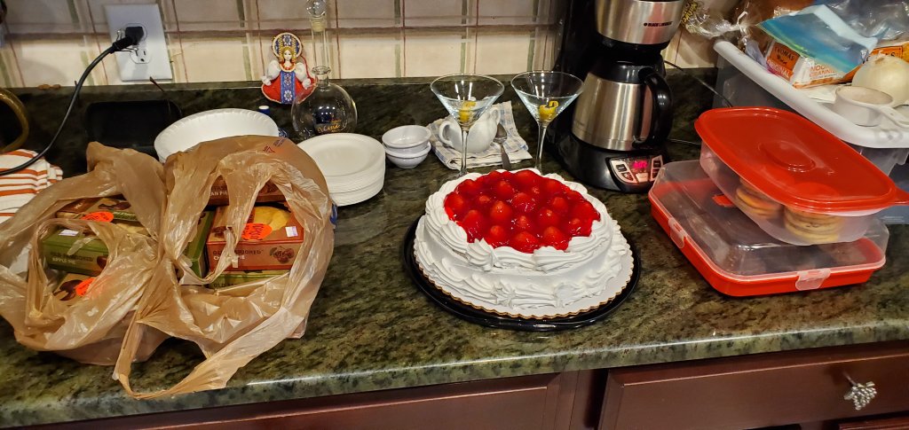 As usual, we ended up with a lot of desserts. Cake with strawberries, cookies, brownie concoction (don't ask), individual pies (great for COVID gatherings) and more cookies (not yet in shot).