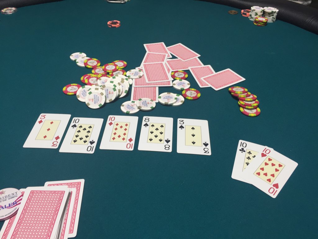 Playing mixed games. In for $40. $70 in cash underneath. Got it in on the turn with 88 against aces in double board. 478J and QQ8x