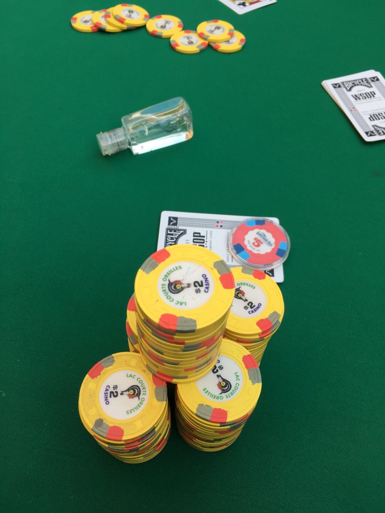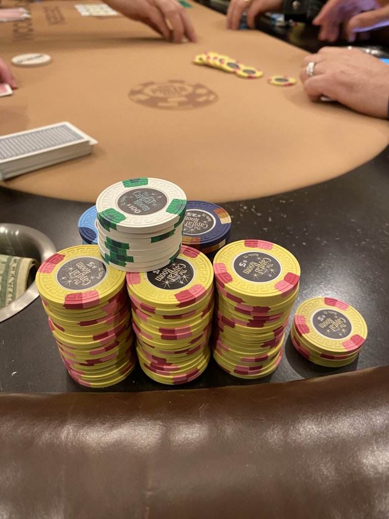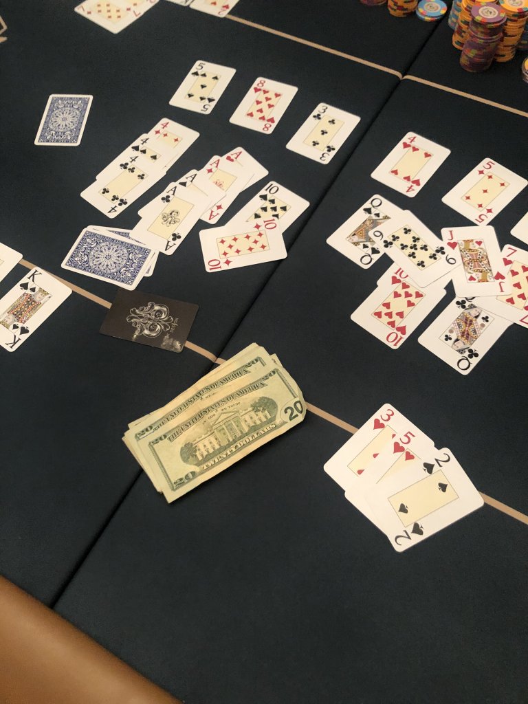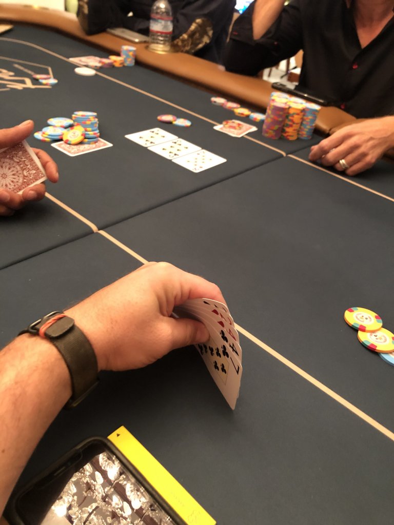 I’ve played a little of most draw games, usually as pot limit, but the only draw we played tonight was Kri-she (5 card split into hold em and super holdem with a one card draw after the flop in the super holdem hand). Those pics of people looking at their hands like it was five card draw were pics of people trying to figure out how to split their hands for split games — SOHE and SHE-SHE.