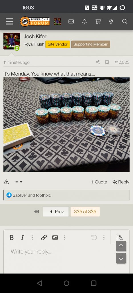 Mixed 43mm in play today in our cash game. Our group absolutely loves these. The AS $100 is so beautiful when in play - and such a bargain as well. The Cincy secondary $1000 is also a super bargain for mint 43mm blaze orange chips. The Cincy $5000 is my favorite grey 43mm that I’ve had here. I just love that big peach spot!