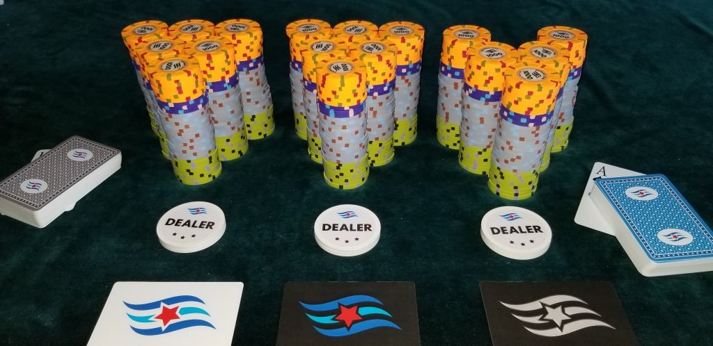 5s and 10s AND .25s and .50s on the table are ‘allowed’?! This changes everything.I know the purists would chastise you for the $10 chip, but I love them. I have a $10 chip in my Palais set, and I think it’s great to get more chips on the table. I also use both $.25s and $.50s in a couple sets. I can only imagine the tongue lashing for doing such a horrendous thing.