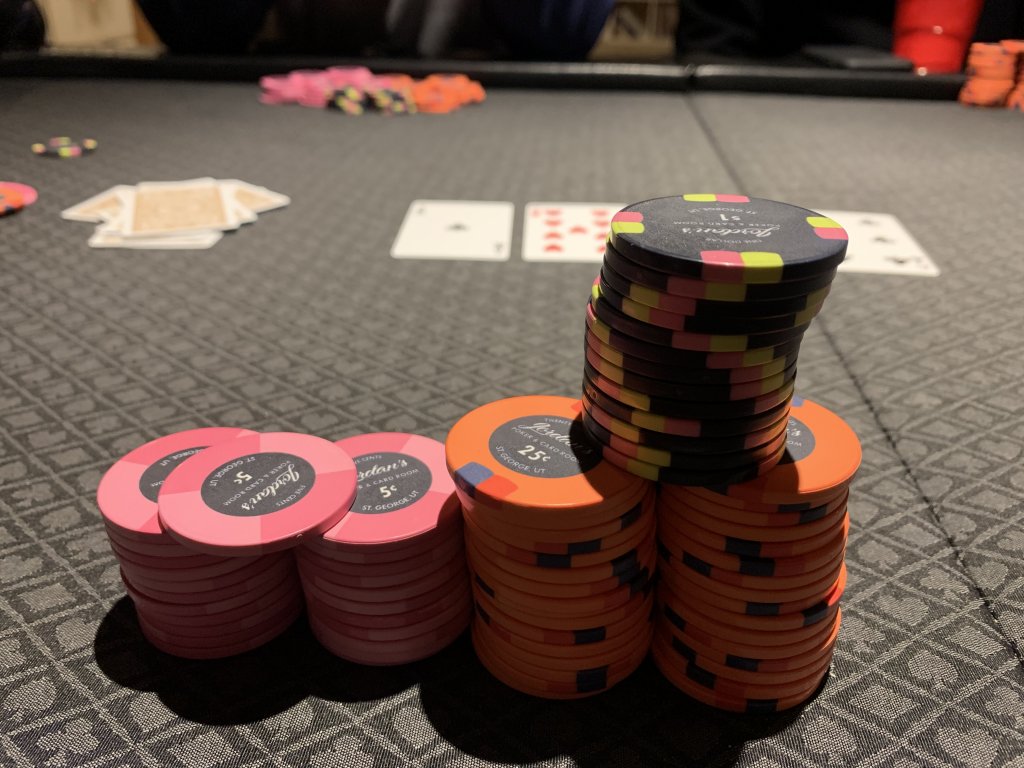 What chips are these? They are sweet.Fun three way all in late game. TT covered both JJ opponents for a huge chip lead and eventual win.