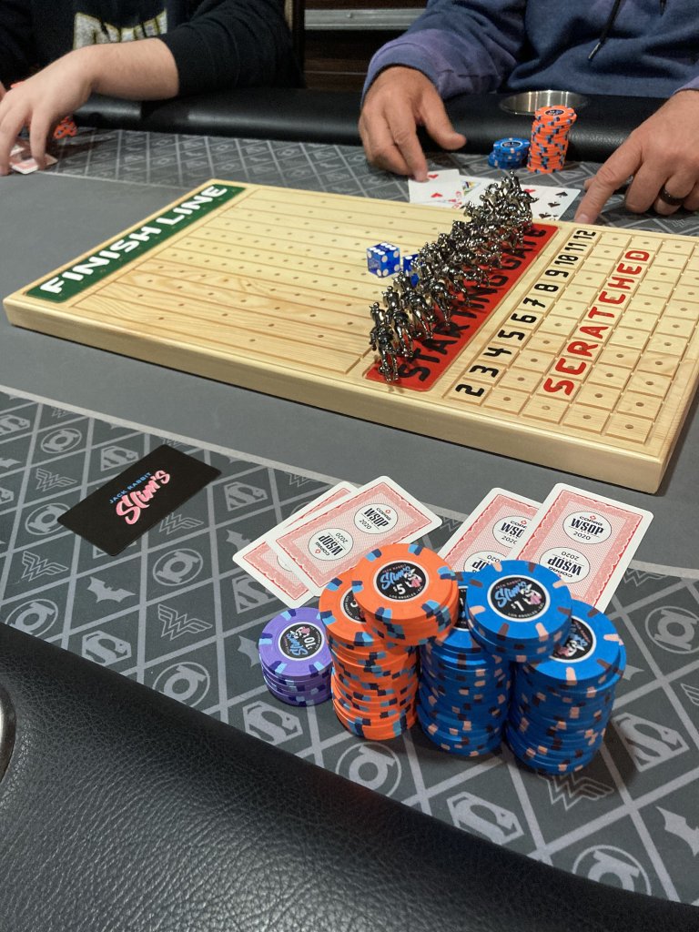 Here you can see the 4 horse was scratched in the $4 position. So every time someone rolled a 4, they paid $4 to the pot.