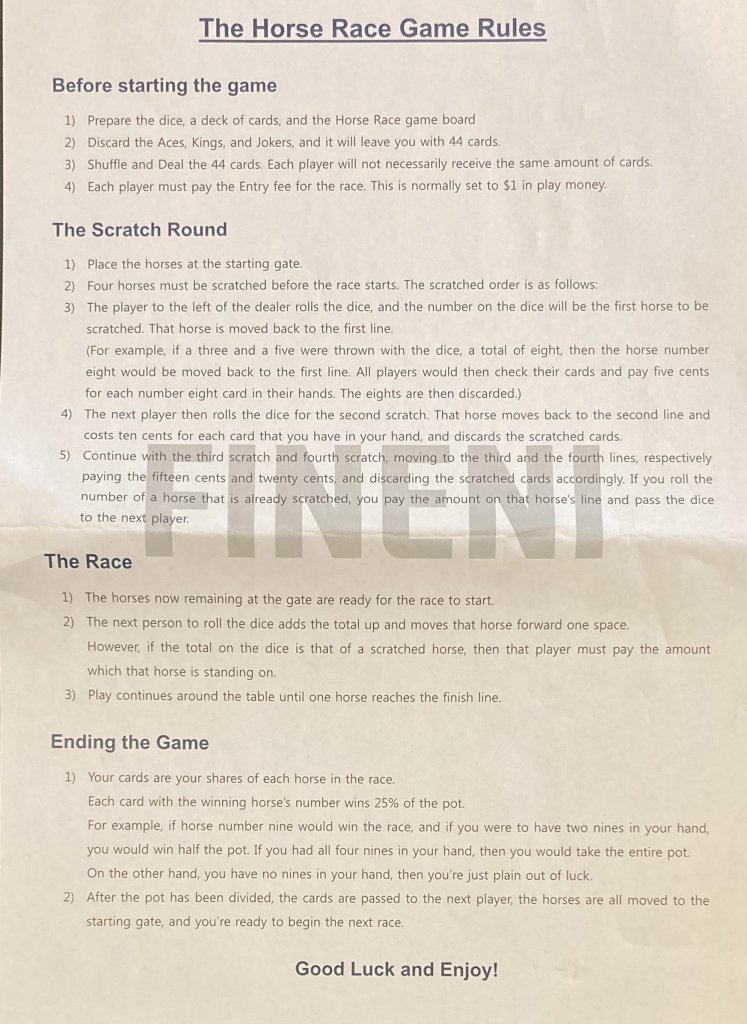 Basically you deal out all the cards with the aces and kings removed. Those cards represent your bets on horses. Then you roll the dice to determine 4 scratched horses. So say you roll a 9. The 9 horse is scratched and everyone with a 9 card pays $1 and discards their nines. You roll for three more scratched horses that will cost $2, $3 and $4 each. Then the race starts. The first player rolls. If the number rolled matches a horse that was scratched, you pay the $1/2/3/4 cost and past the dice. If not, you move the horse forward a peg. Keep doing that until a horse reaches the finish line. Everyone with a card of that horse wins a quarter of the pot. So if the 11 horse wins, everyone with a jack wins. If you have two jacks, you get half the pot.