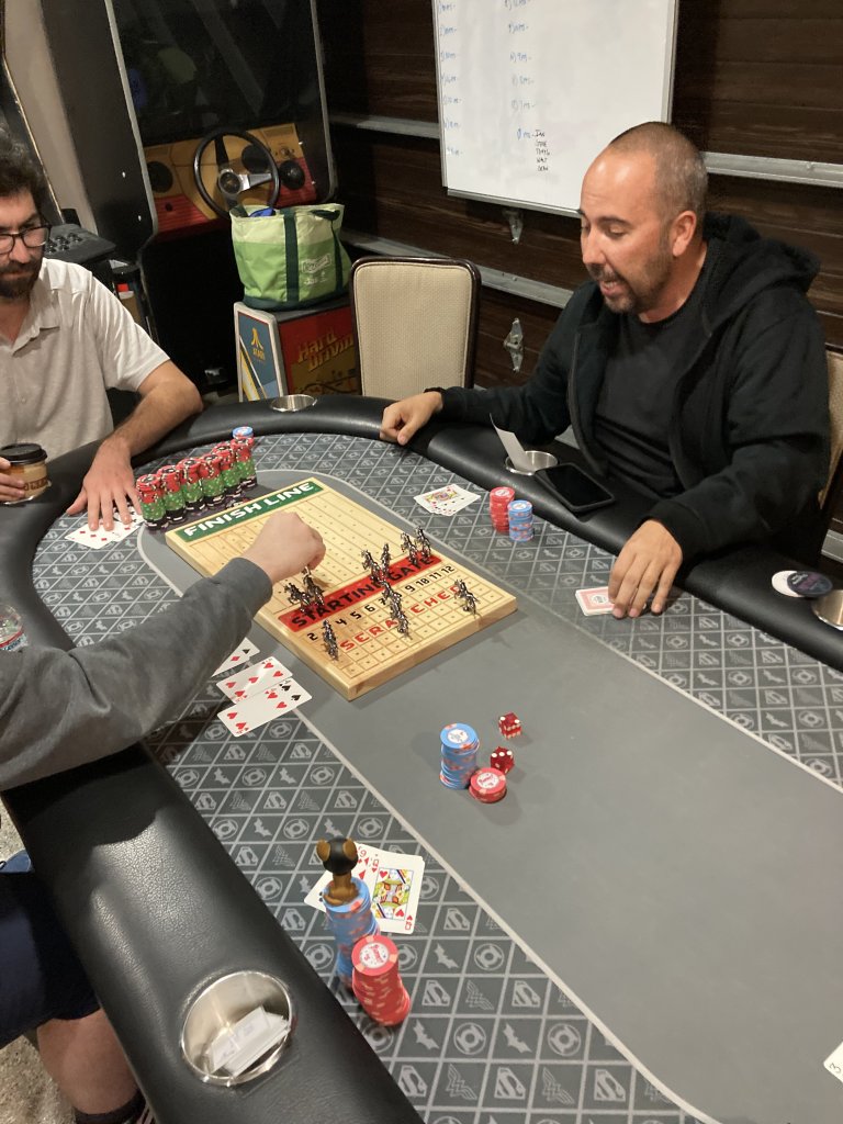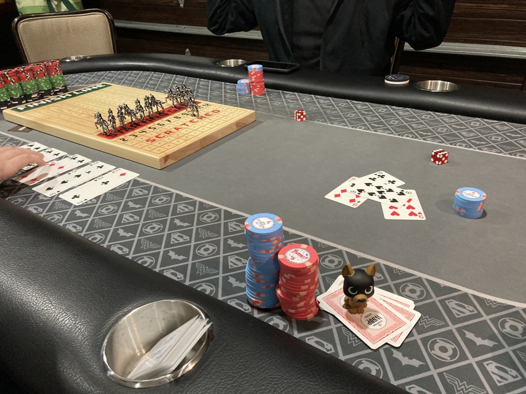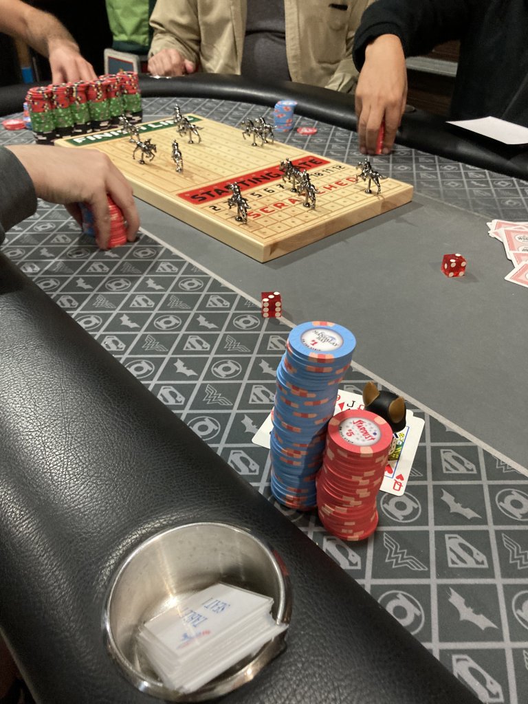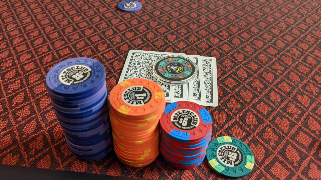 Chips. You can see the pot here — probably about $70-80 (mandalay $1s and stardust $5s next to the board) in there and it looks like the race is about half way to the finish line.