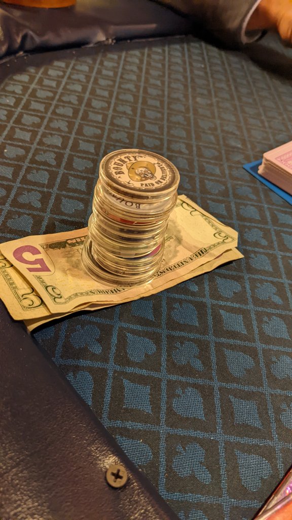 Ended up with almost half the bounties (field of 16 + 2 rebuys, I had 8 bounties) and a 5-person last longer bet for another $20.