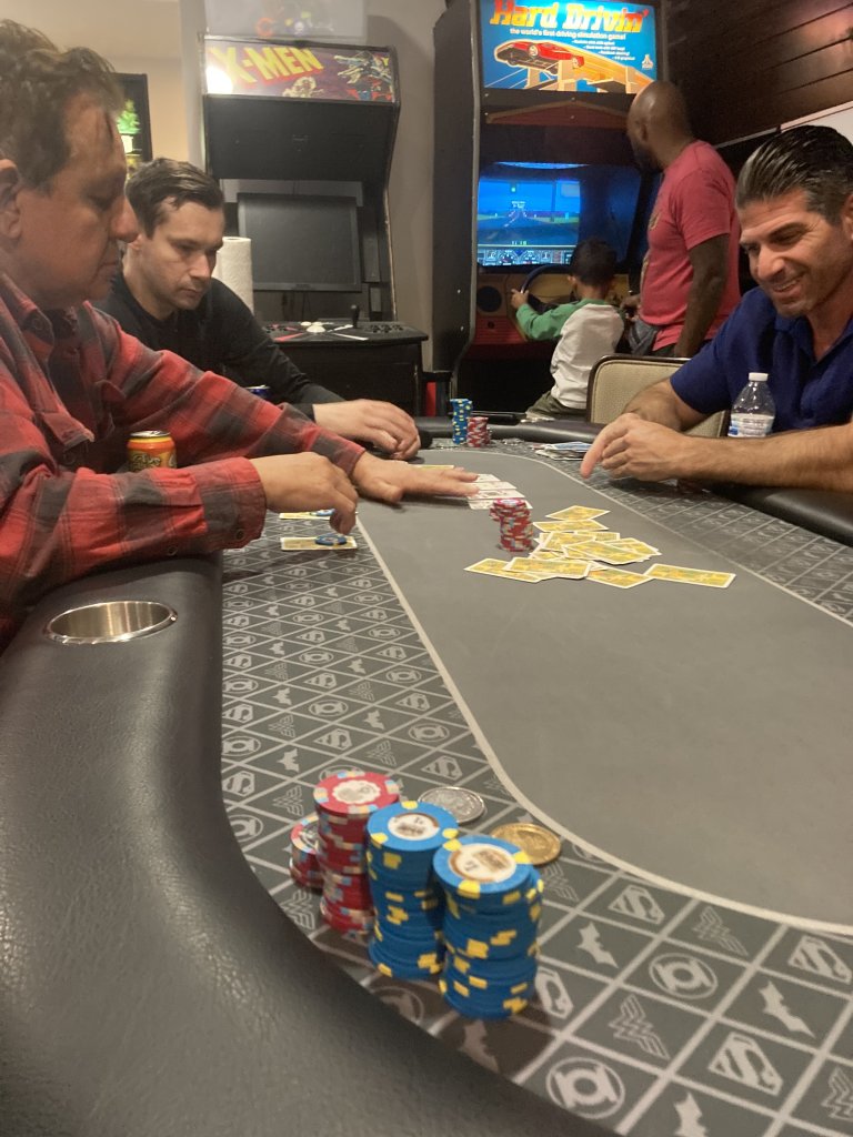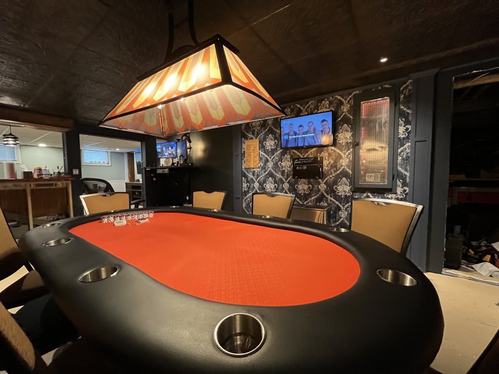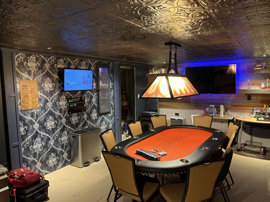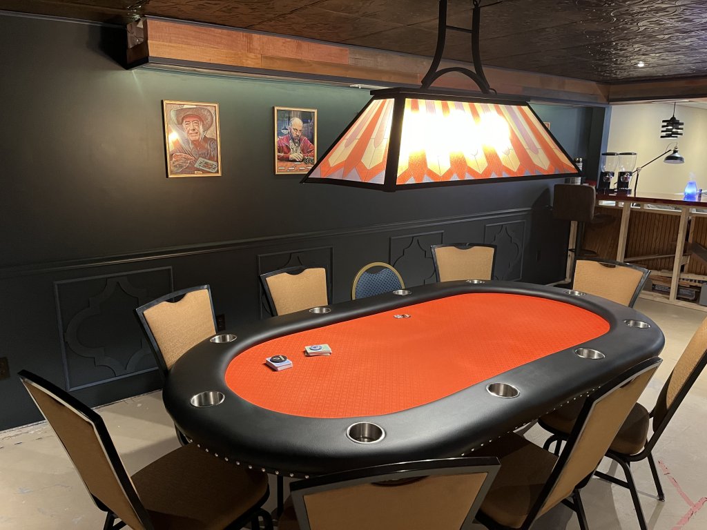 I see the hot dog roller on the floor....Getting ready for poker night at the Hammer Room!! Can't wait. Hopefully post some in-game updates. Still working on the room (floor and wet bar) but it's more than functional. Labor of love! Room and table all my own blood, sweat, and tears. Man I love poker.