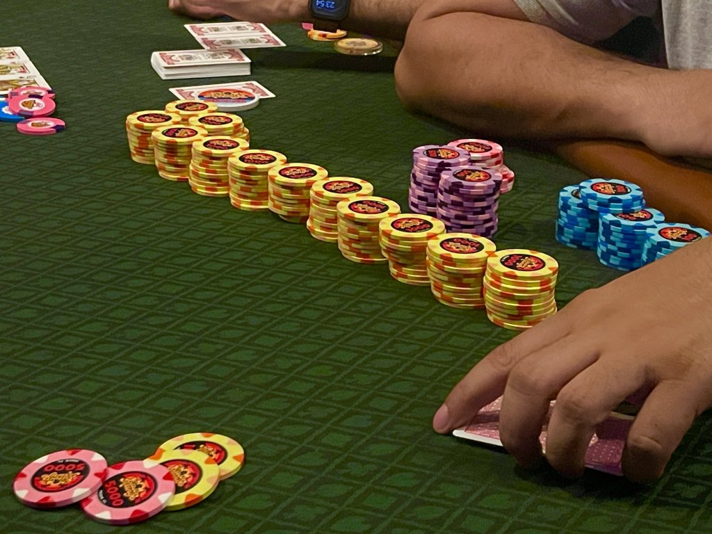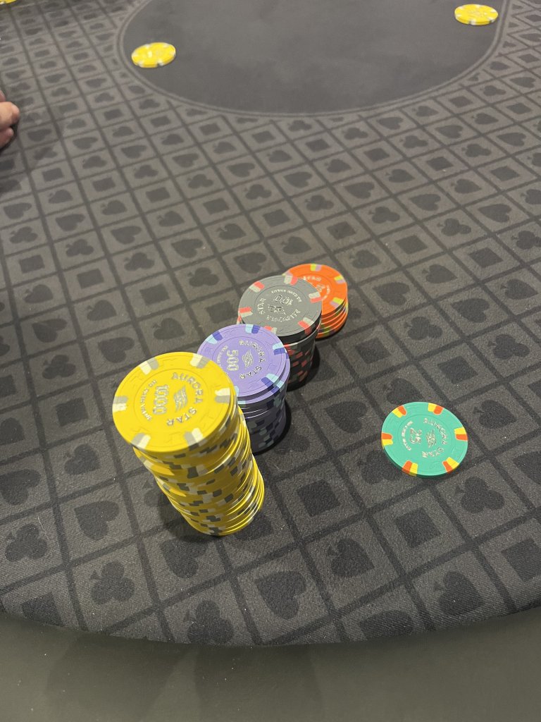 I don't think anyone answered your question. On tournament chips I've always considered the "standard" colors to be 25 = green, 100 = black, 500 = purple and 1000 = yellow. Then if going higher, orange = 5000. With a set like these guys are using, colors used may be somewhat constrained by the numbers of chips available. And the weird use of a T50 chip. Maybe he doesn't have enough of any particular color to support T25, thus he tosses in the T50s.