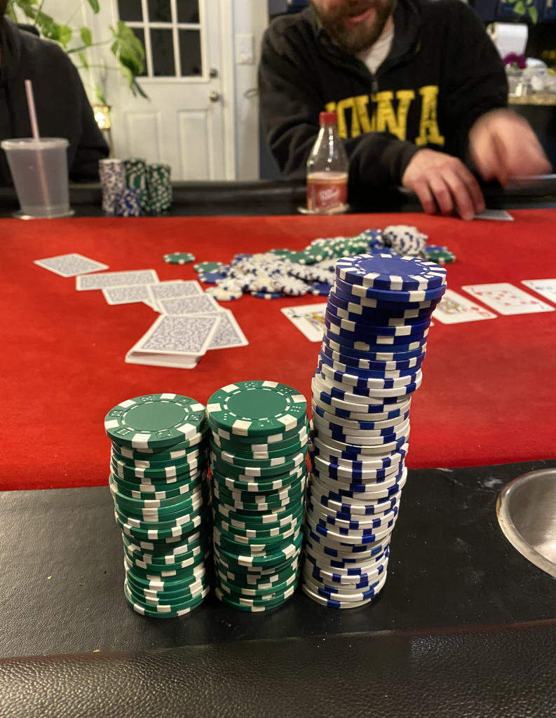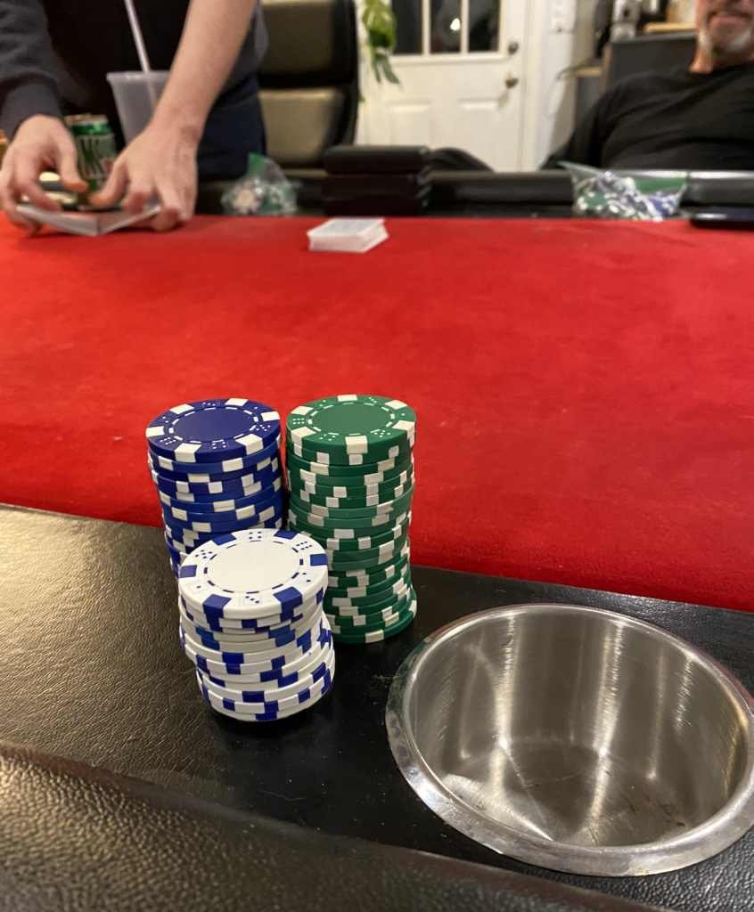.10/.20 NLHE, in for $20 out for $110. (Blue= .10, Green .25 and White $1. Busted the reds out later, $5)