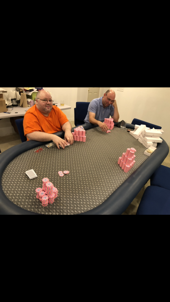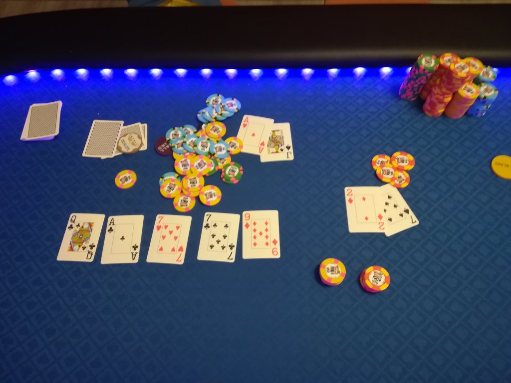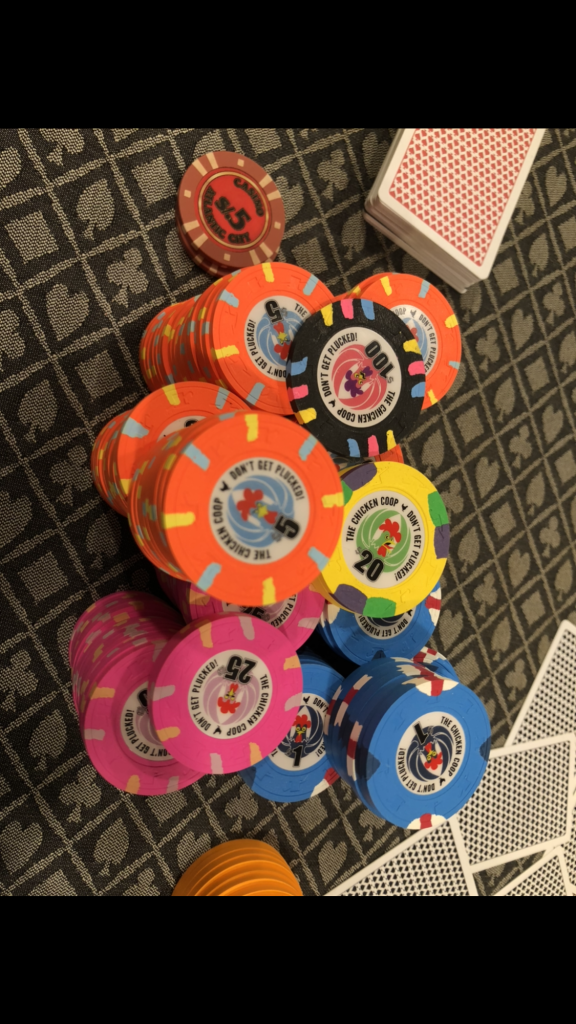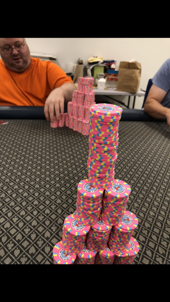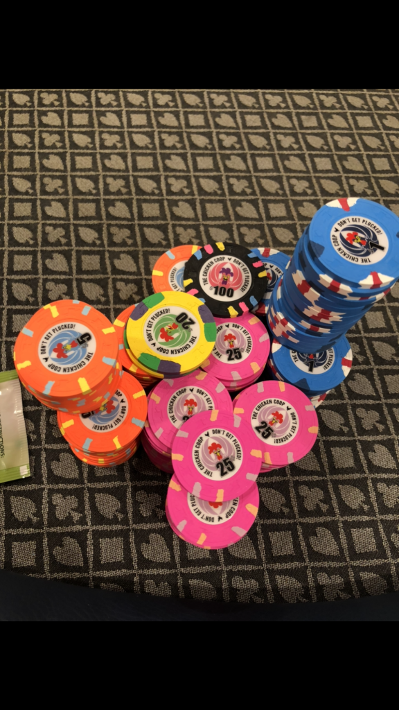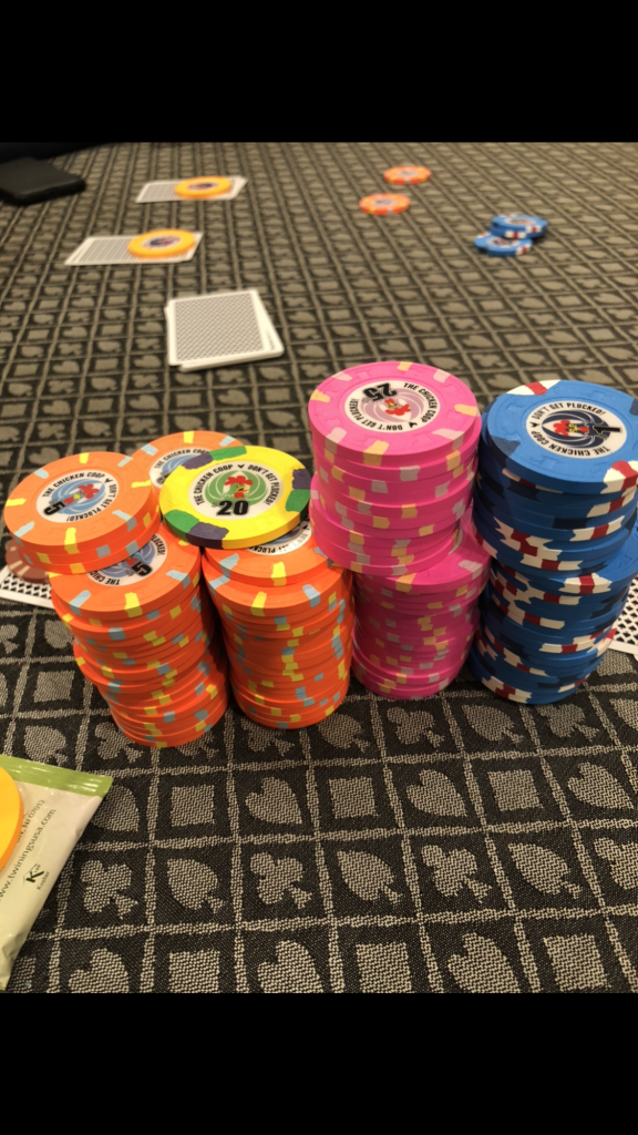 It’s Scarney, it’s the river, Chicken loses his straight flush when he is forced to discard. He ends up with like a 15 high and high King. I scoop with a 12ish high and a pair of 3s.