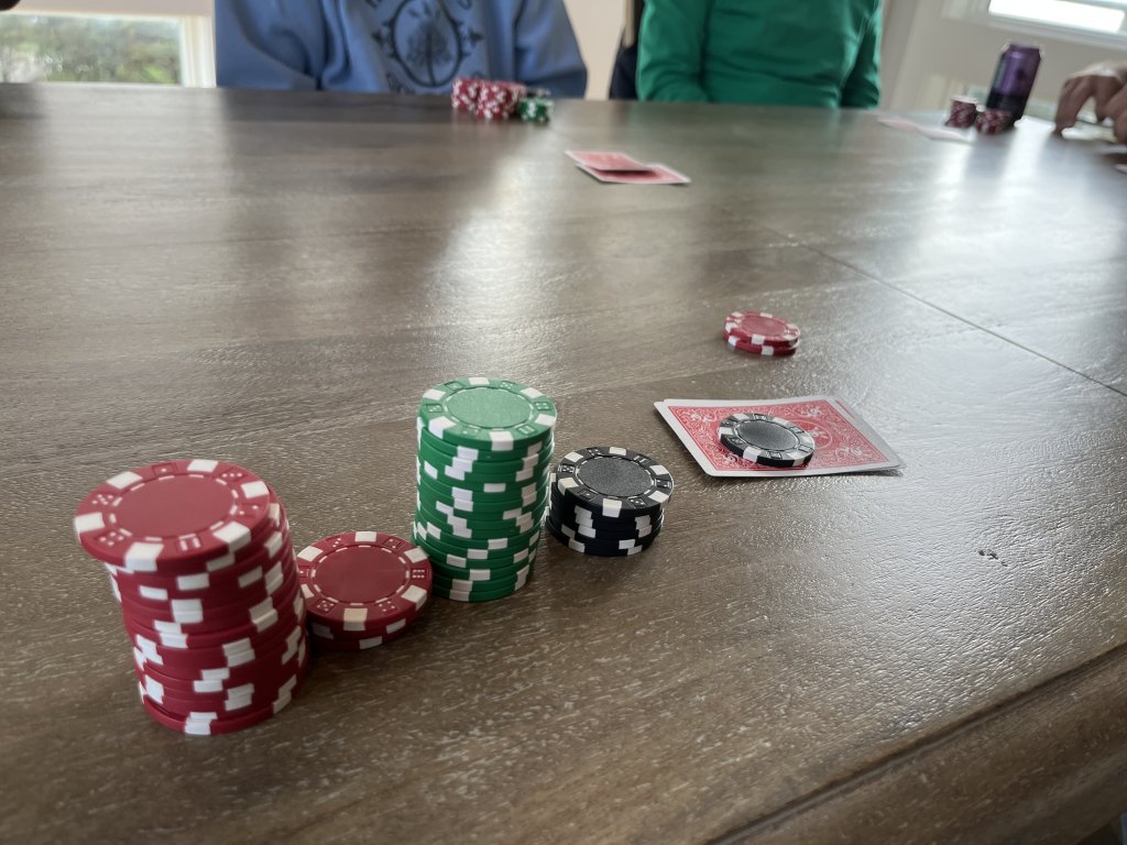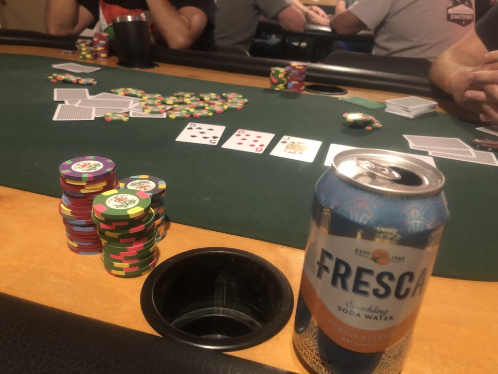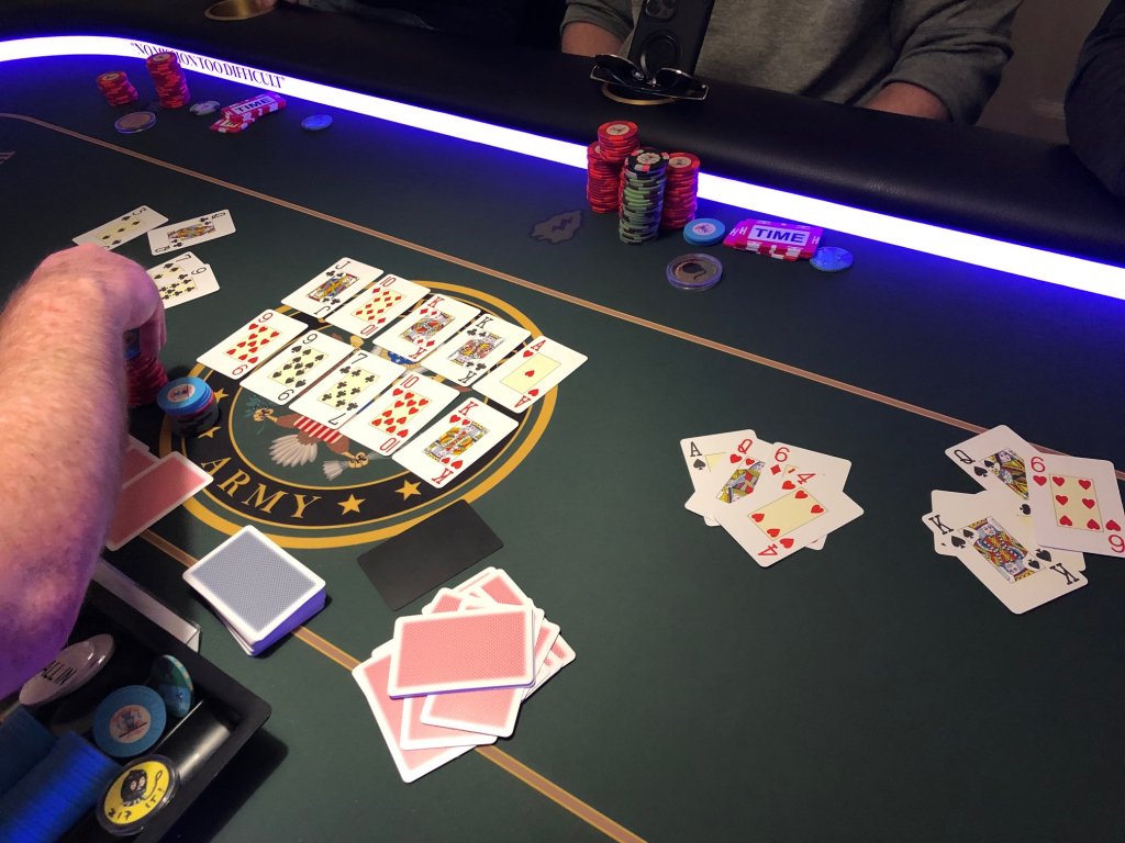 Ah, the old “dice chips on a hard table top with playing cards that look like they were run through a washing machine a couple of times” poker night.