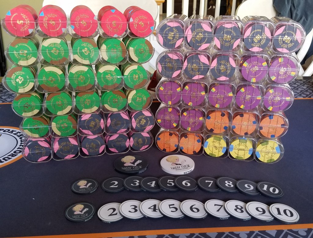 But... what are the denoms?The quality poker table is what my friends mostly gush over, although they're happy to play with great cards/chips. One guy still asks what the denoms are every single game; you'd think "read the f*cking chip" for the tenth plus time would eventually stick in his brain but here we are.