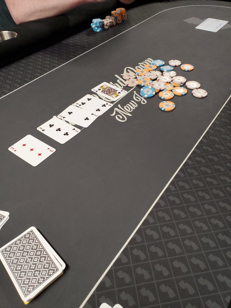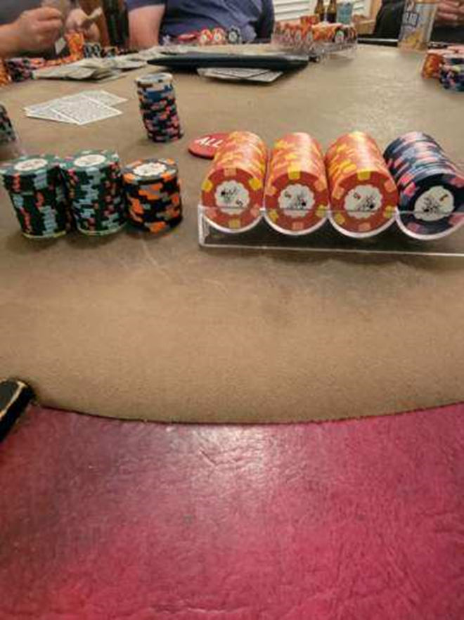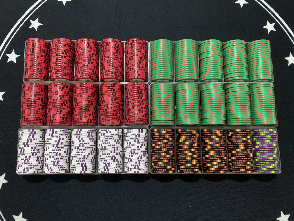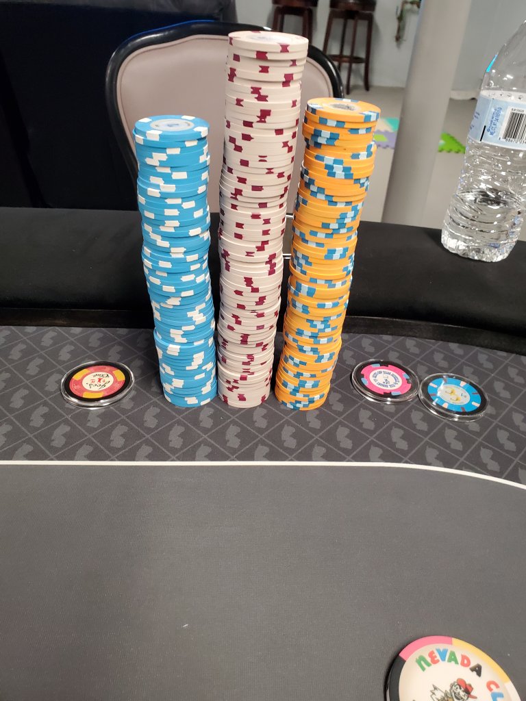 The pics with the DDM ceramics is a completely different game from the one with the WHTC chips. The former is a loosely run $1/$1 dealer's choice NLHE/Omaha-hi game that is driven by a player who plays wide and is overly aggressive. Half the players (including Hero) are willing to mix it up by playing against him in bloated pots pre-flop and being sticky post flop if they catch any part of the board.