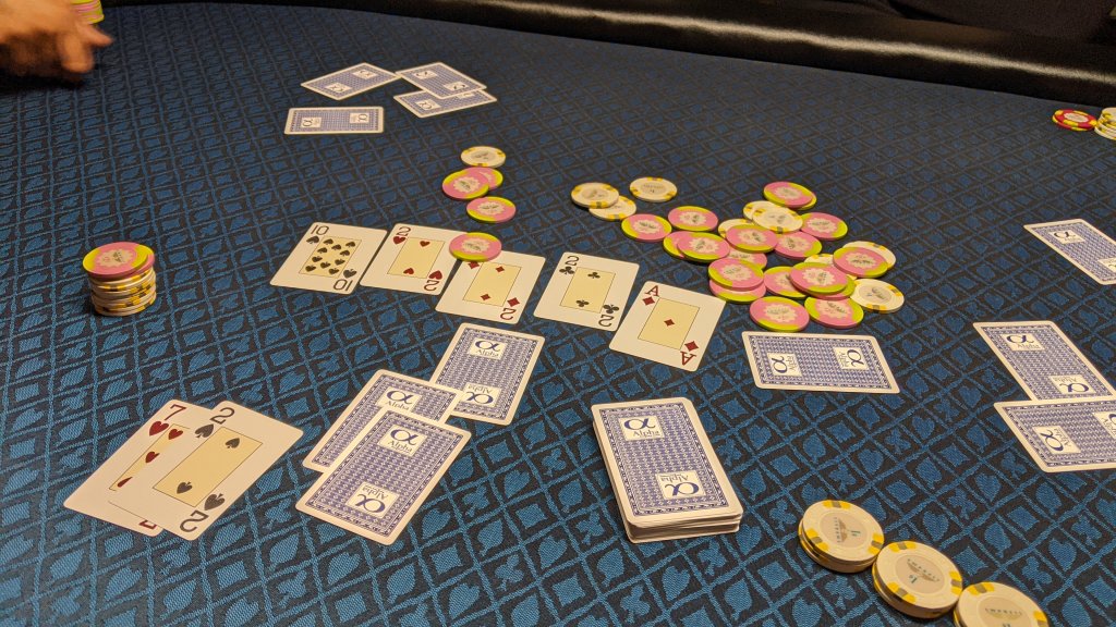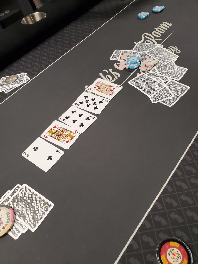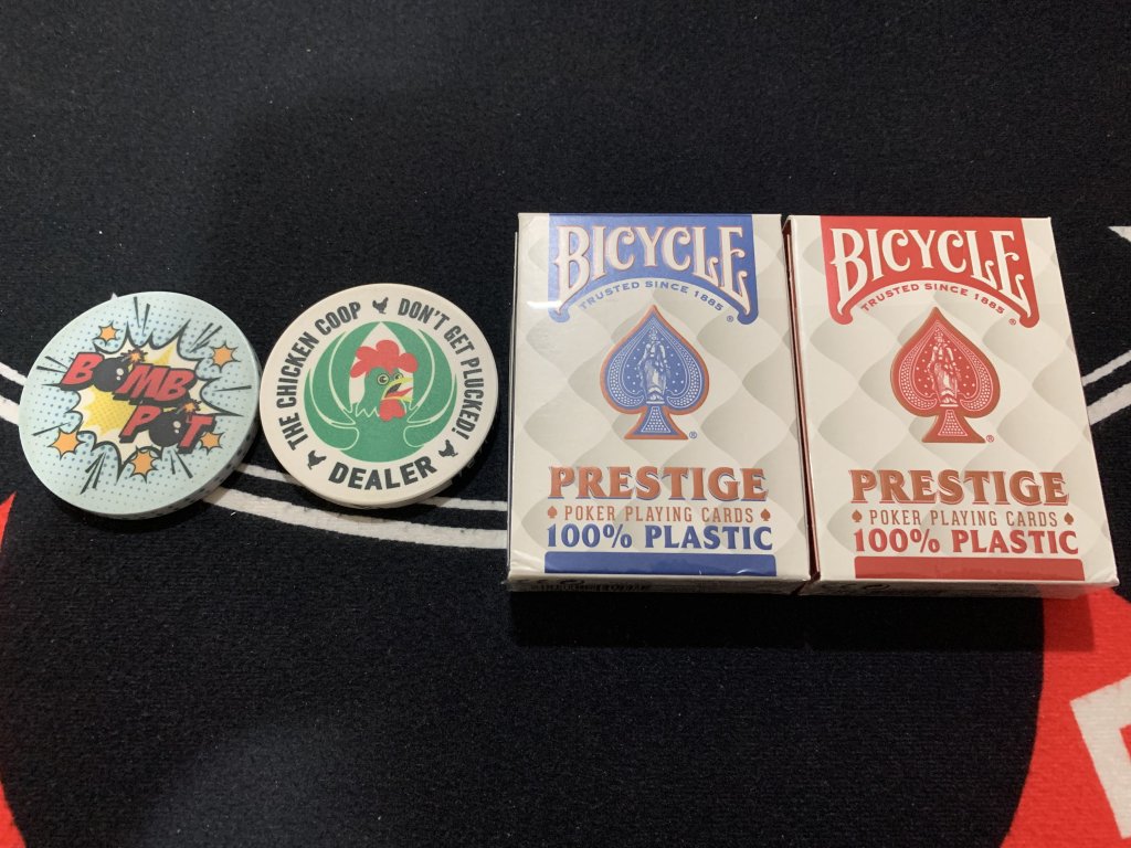 The later game is much more structured and is Hosted by a person who owns multiple businesses. The Host's philosophy is if he is going to take time to have a weekly game then players better come prepared to lose three bullets of $300 before leaving. Bad beats on the second bullet being the exception. Two decks are in play. One is shuffled two behind, the player on the right picks up the deck and hands it to the person who just dealt, who then cuts the deck and places it on the cut card for the next player who's turn it is to deal.