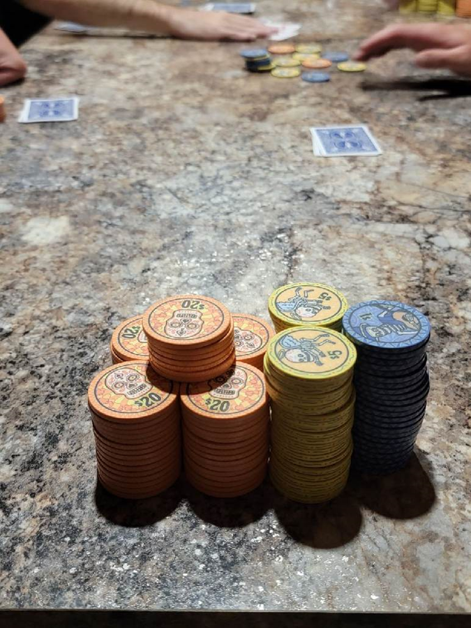 Cards come first, socializing second. There is always 10 players, eight of whom are regulars, leaving two seats open for the five to six standbys. A $1000 bucks is chump change for the three regs that are business owners and the one player who as an only child inherited a small fortune when his parents passed. The majority of the regulars are in their late fifties. Hero is 54. The standby list largely consists of players in their mid to late thirties. Drinking is limited to two players who will consume six to eight beverages during the course of six hours, the length of the game. From time to time, the person who runs the bank will have three or four mixed drinks.