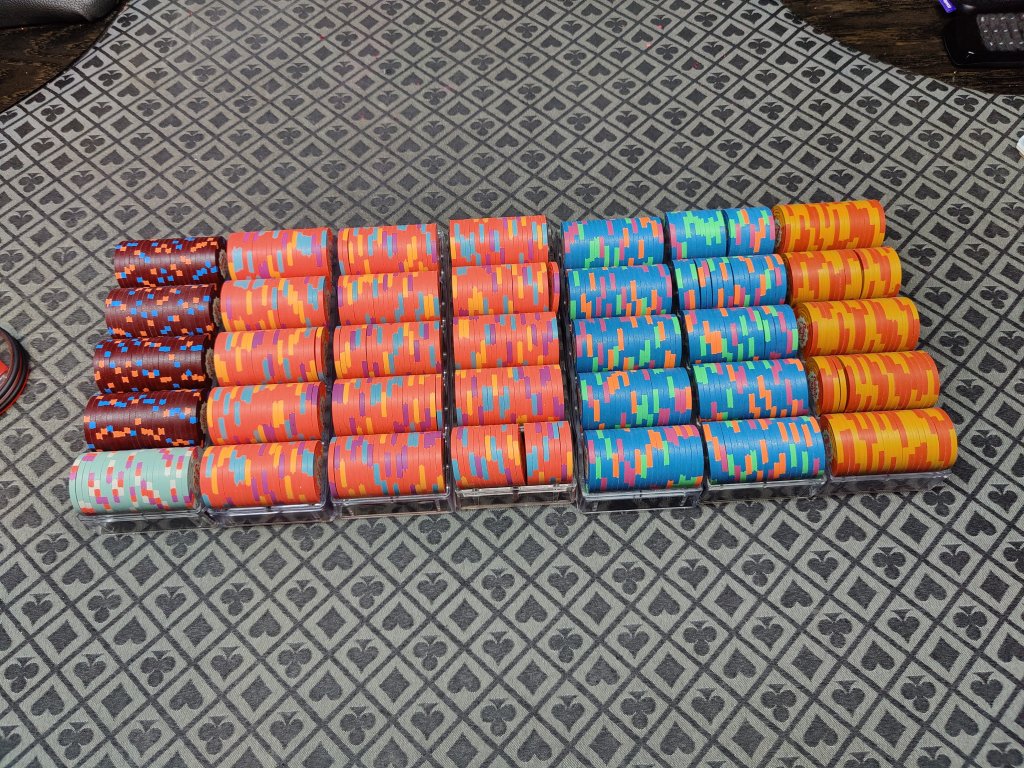 We played with $5s, $10s, $50s and $1000s (used as $100s). Small tourney style game, starting blinds 5/10. Didn't expect the game to go so well for me, but it went really well. Ended up placing 2nd out of 5 of us, I'll take it. These chips looked so good amongst each other. Will definitely be using them more in the future.