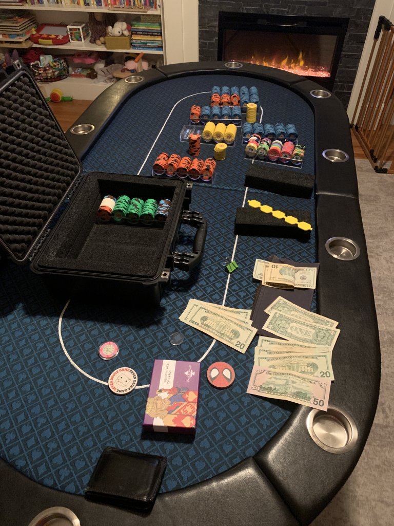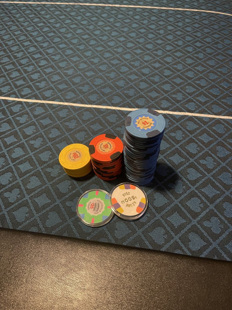 Then, of course I had to play heads up against @Fynnysh! This is starting to become a tradition every time we play or when he's back in town from school. Got the Desert Sands TRKs into play for the 1st time after owning them forever paired with the Wilbur's $20. $1/2 to begin and blinds escalated into play. The last time we played he took the dub, but this time, I TOOK IT! Let's GO! :LOL: :laugh: