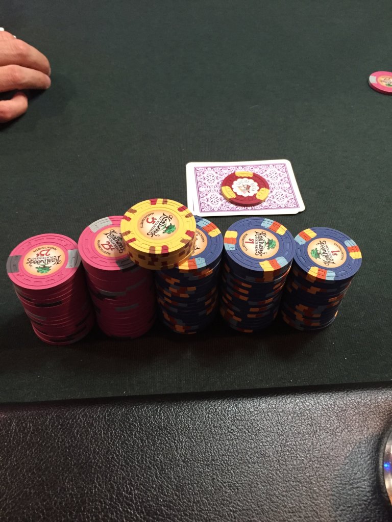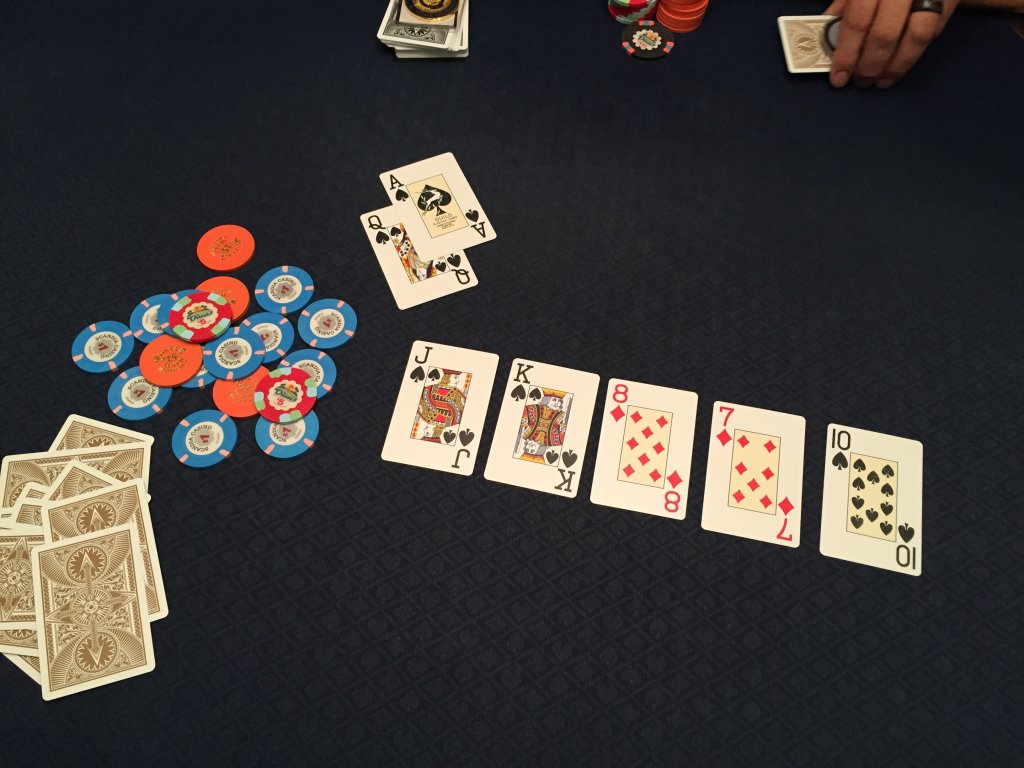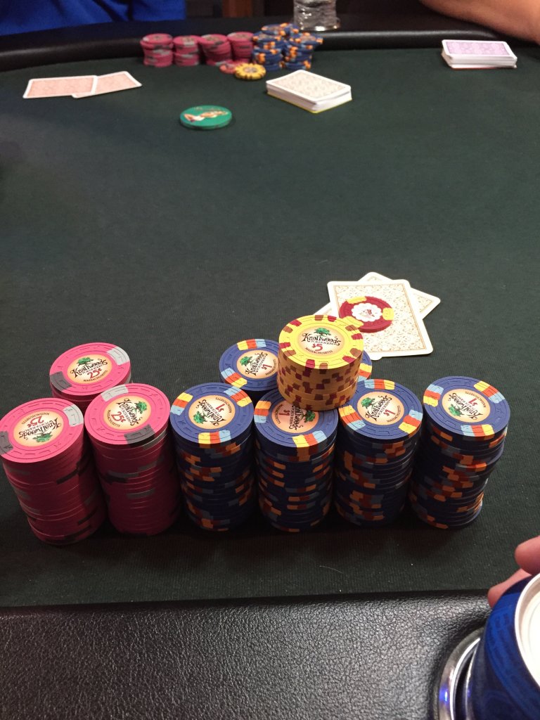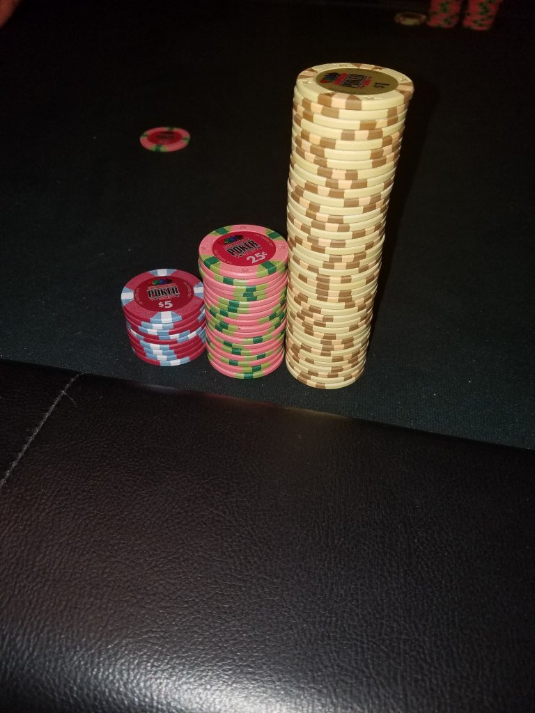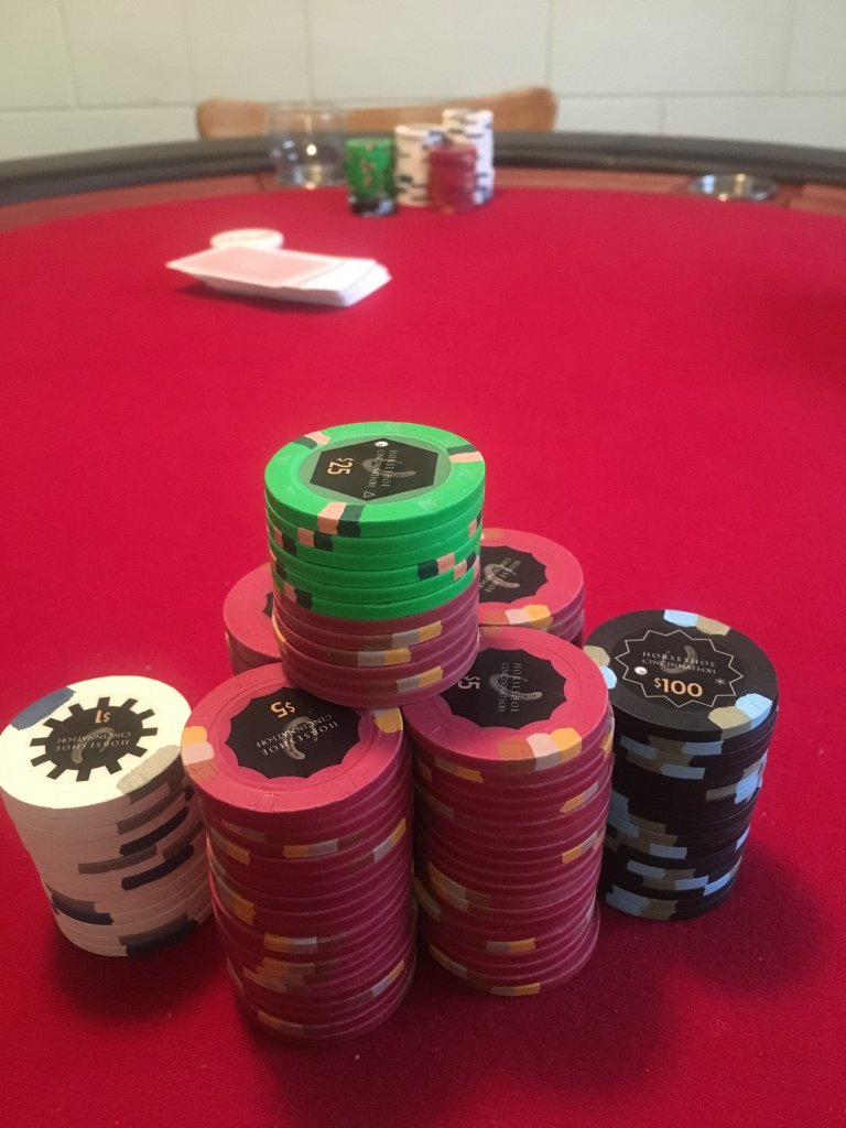 My stack at some point and the high hand of the night in NLHE. 100 in, 348 out. First royal ever in my game.