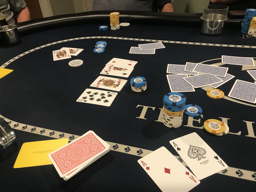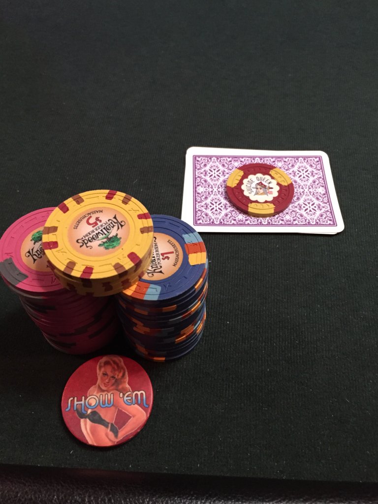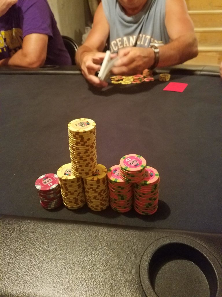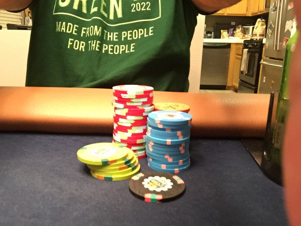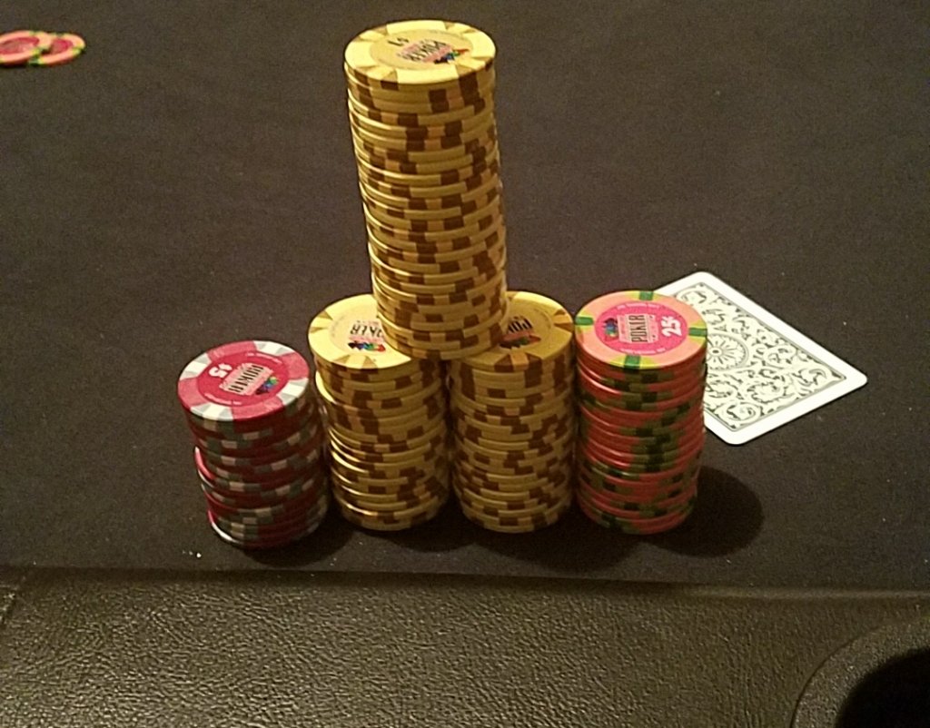 My stack at some point and the high hand of the night in NLHE. 100 in, 348 out. First royal ever in my game.