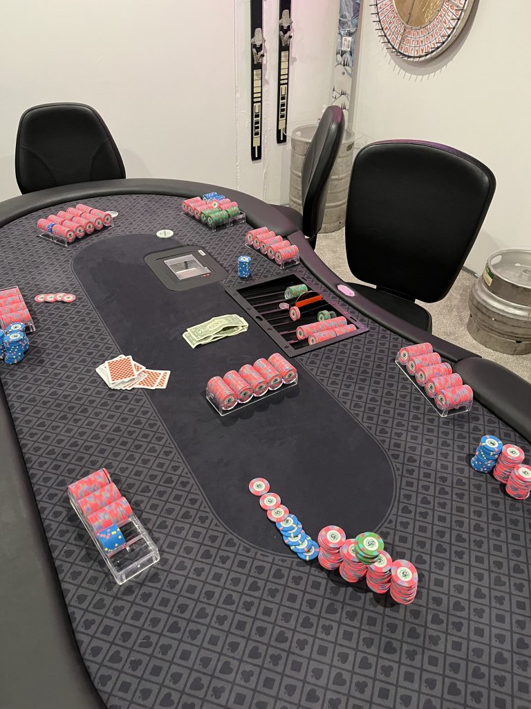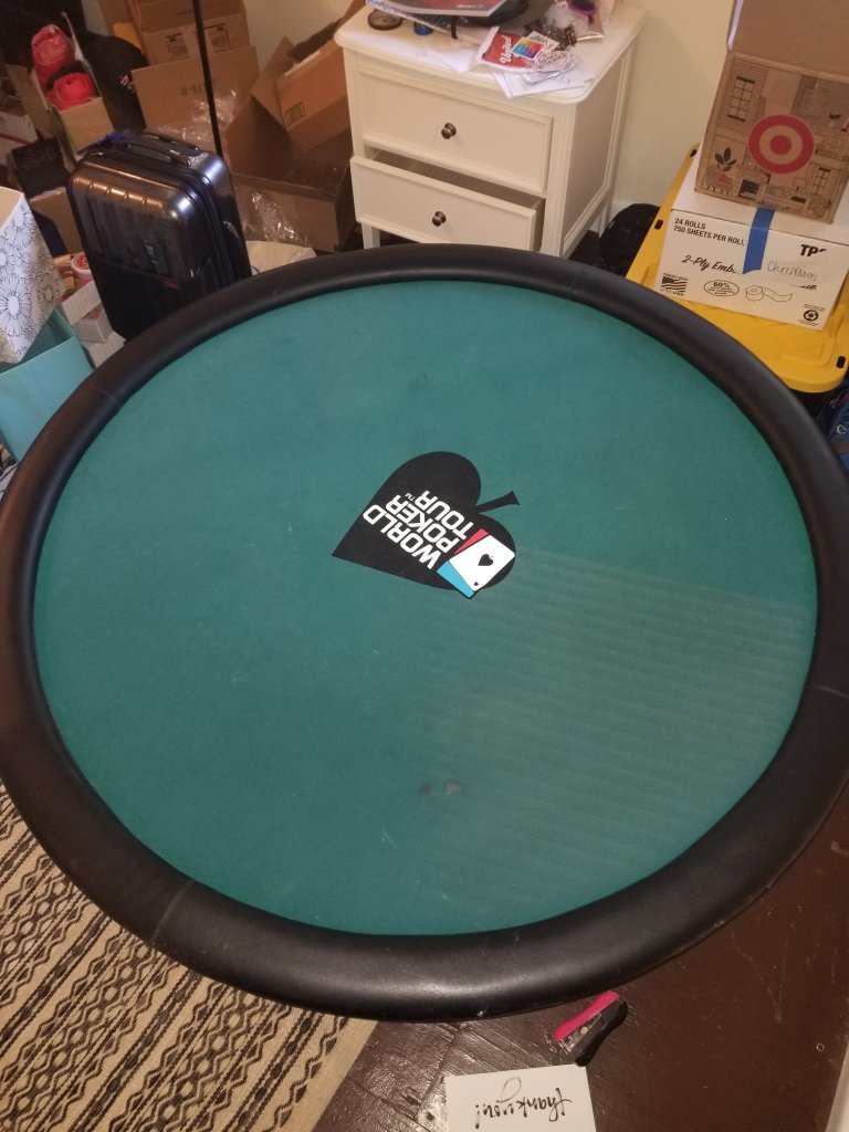 I’ve seen those tables and considered getting one to re-felt as well, as I assumed it’s pretty light and easily transported. Is that the case? How sturdy is it?Dog aside, fooling around on the new speed cloth on the table. Yard sale 50 bucks, base is cheapish but cloth is gorgeous and plays just fine. After and before pics. And before I get chirped on the chips, they beat the basic dice chips and my customs are on the way.