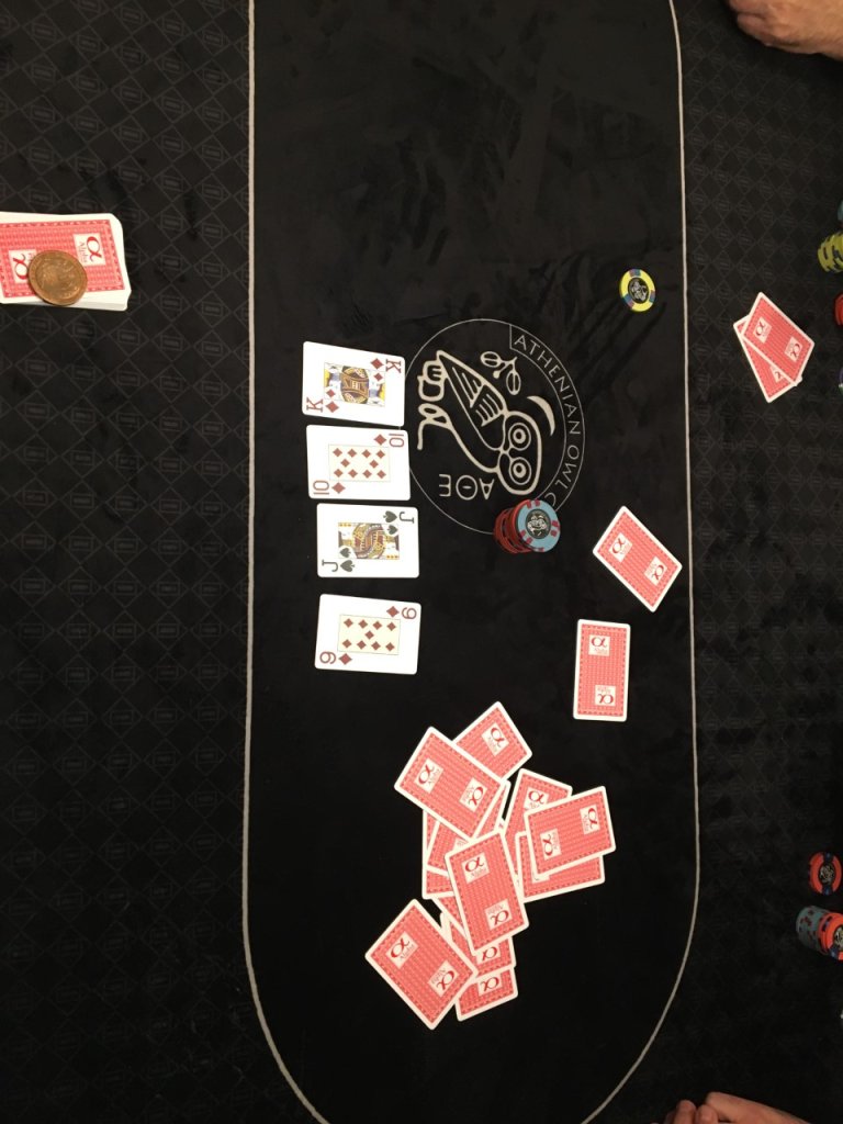 The table is meant for 8-handed or 9-handed games, but we got 10 players and more than 2K on the table tonight, due to the enthusiasm. :)