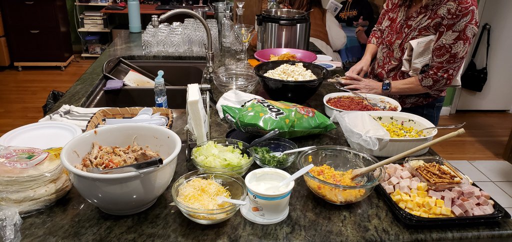 I made chicken tacos in the pressure cooker with various toppings. Sides of corn, meat/cheese/pretzel, different corn, cheesy bacon, popcorn, and chip/dip.