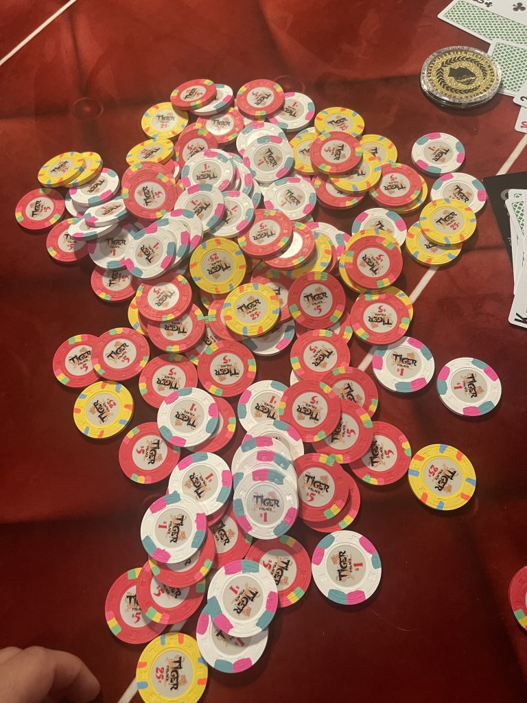 Celebrating lunar new year yesterday with family. We had about 10 players. I lost $60 but the wife won $60, so we broke even. Fun night