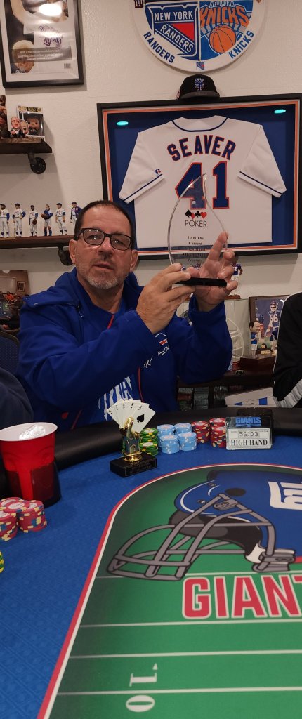 Great night of poker!!! Terrible night of football. My Giants ran into a buzz saw of a team. I looked like the Giants there for a while. Having to buy in for another $100. In for $200 out for $234. Made a comeback but wish my Giants did!!!! Started at 6pm with 9 people then the last four played for a while calling it a night at 3:01am. Thanks to @Shaggy for dealing and always keeping the game going smoothly.