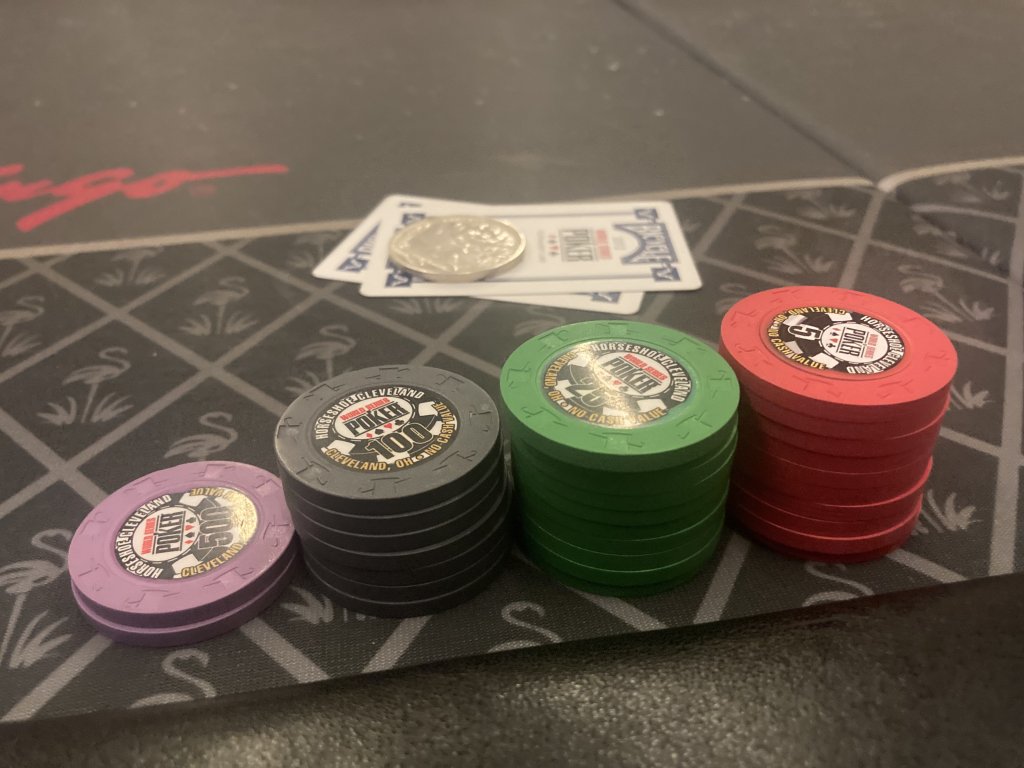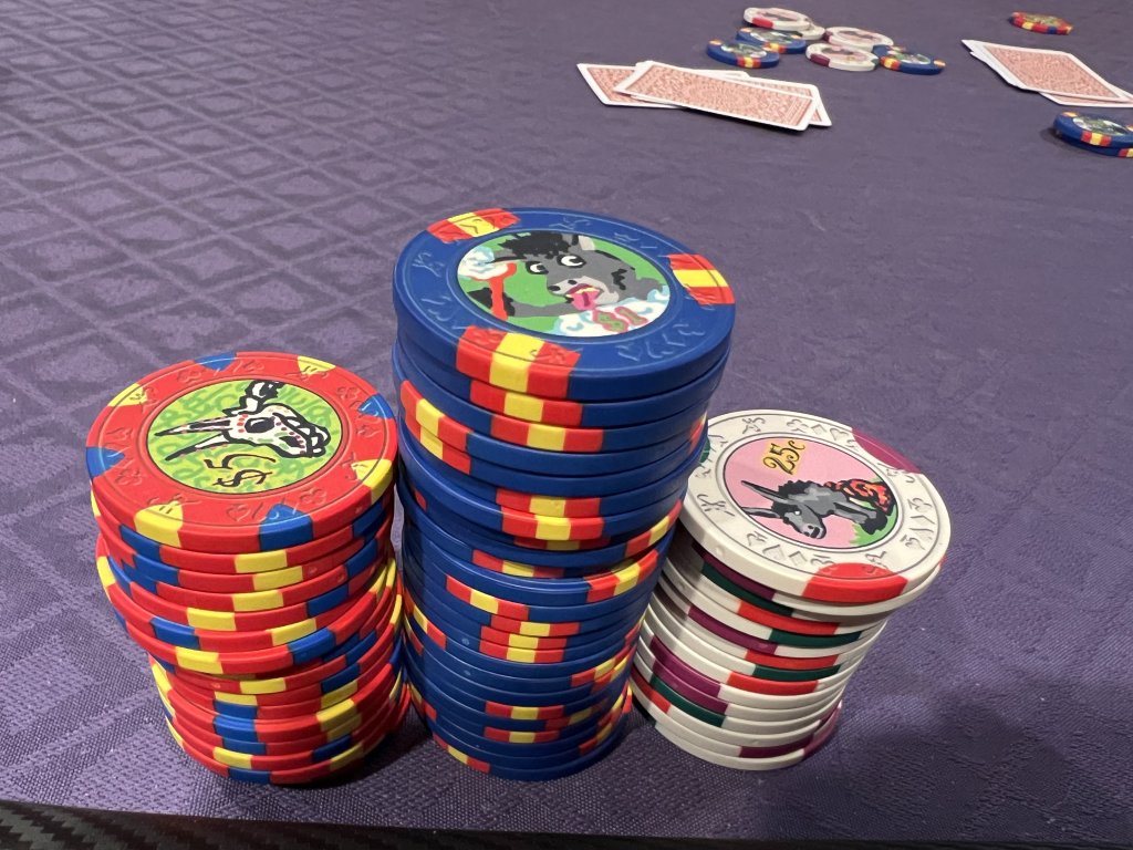 Got stuck on the last hand of the night when my set of kings ran into a flopped flush. Had to call bets getting 8:1 and more but the board didn't pair.