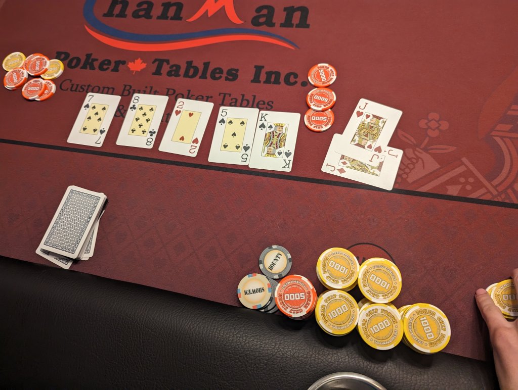 In this game, we had a couple late cancellations, so had my 10 year old daughter fill in for a couple hours as a player. Held her own, and got stacked boat over slightly lesser boat on the last hand (instead of a parking lot bet, we referred to it as her go to bed bet). That said, earlier in the night she had a hand where she had flopped a straight flush against my flopped ace high flush - I imagine that's a poker memory that'll stick with her.