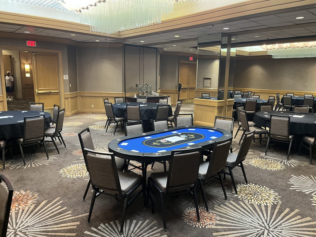 Really nice setup. Great space, Barrington-type table, and decent chairs. The Crown sluggers are pretty nice. A little slippery, but no worse than Matsuis. He bought the Poker Knights because The Crowns don't have fracs available.