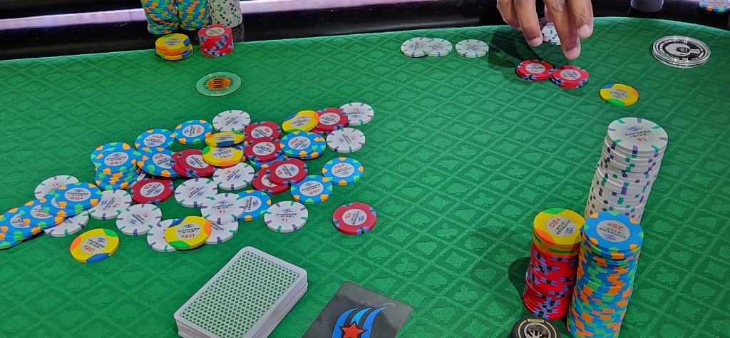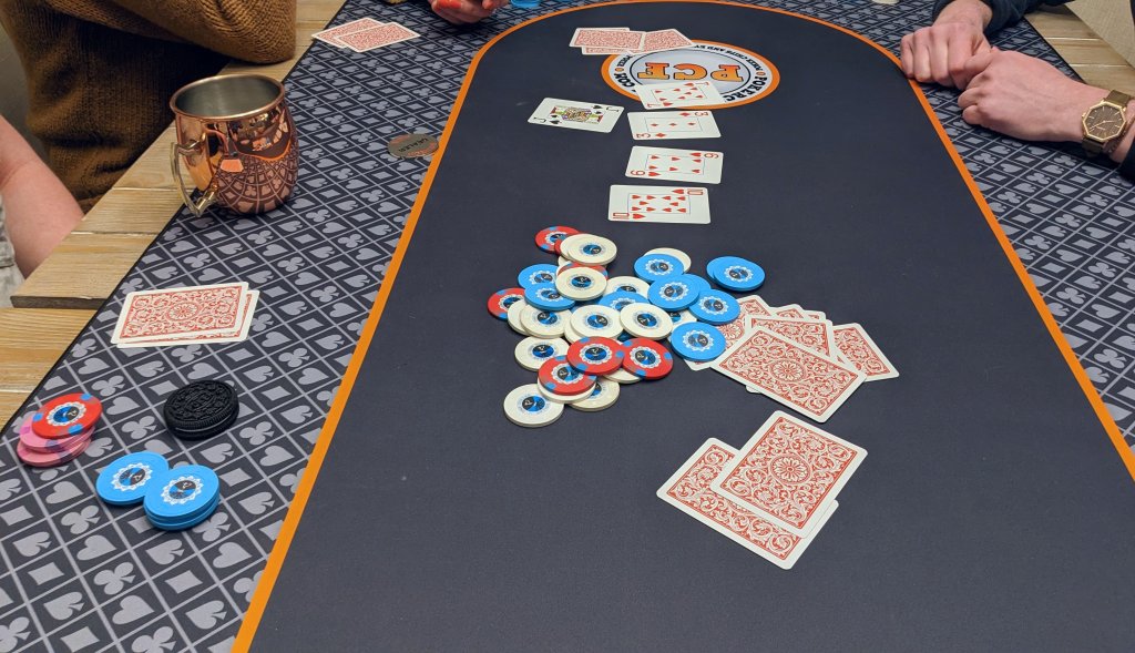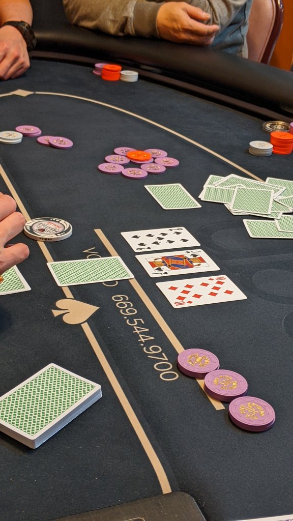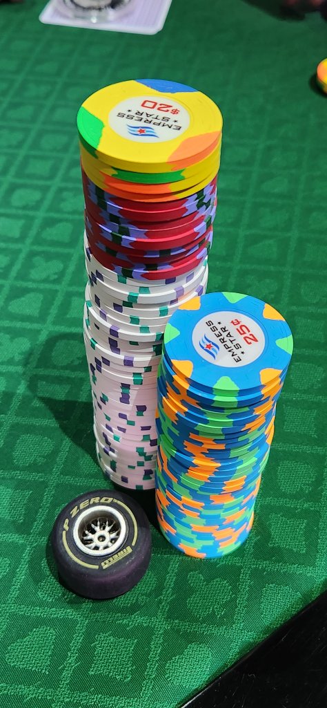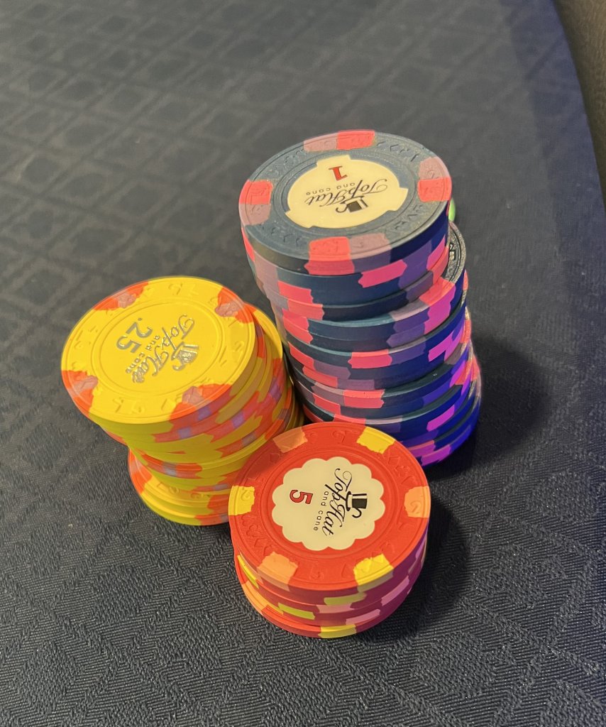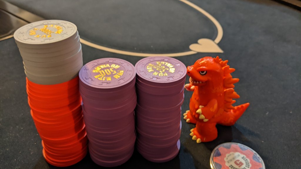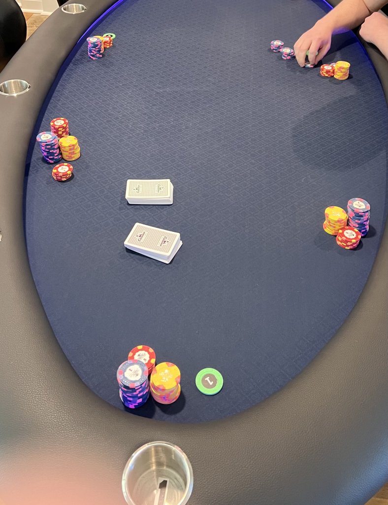 Four handed family game on Easter. $30 buy-in, lots of split SOHE pots and I got to try out my new $85 Barrington table. Great table, but will need a different topper. The material is already starting to pick. Used my pink lemonade quarters and Tiger Palace $1’s.