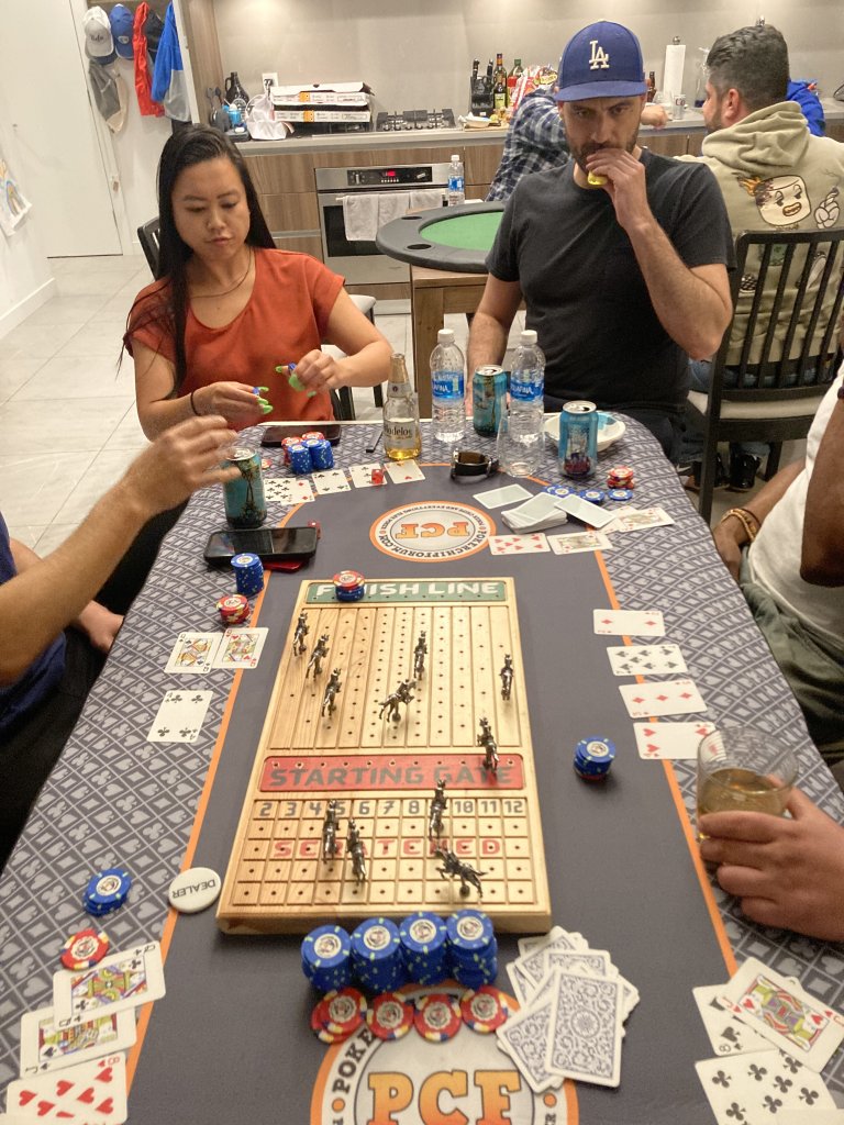 Poker night with non-poker players. Did a little tourney first followed by cash, which ended up being100% horse racing. Fun night.