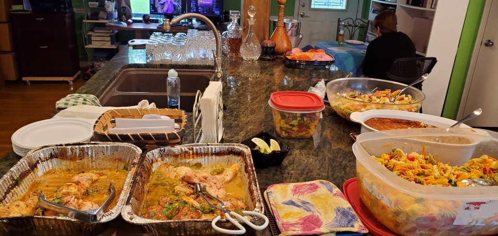 Dinner featured cilantro-lime chicken - one tamer and one with jalapeños. Sides included pasta salad (two varieties, plus a third small one for a vegan), corn pudding, Mexican corn bread, snake bites (small flavorful meats), and cheese/meats/crackers. (Photo is from before all the people with sides arrived).