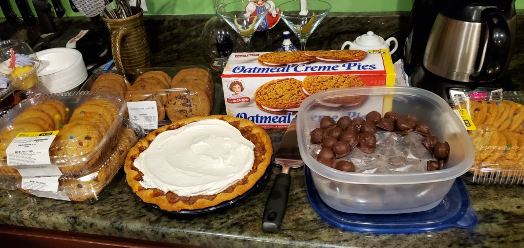 Waaaaay too many desserts, but some very tasty ones! Bourbon pie, chocolate-dipped cookie dough (made with sweet and condensed milk instead of eggs), cup cakes, cookies, and creme pies.