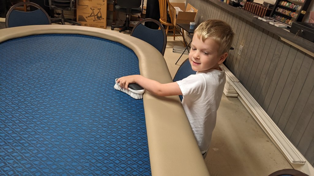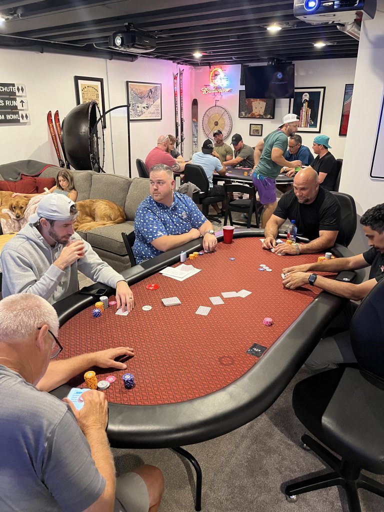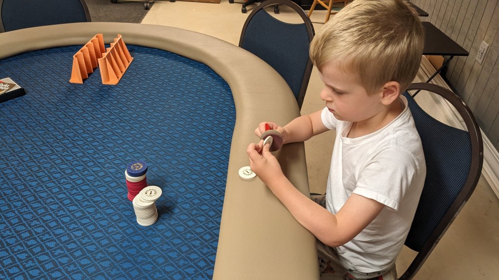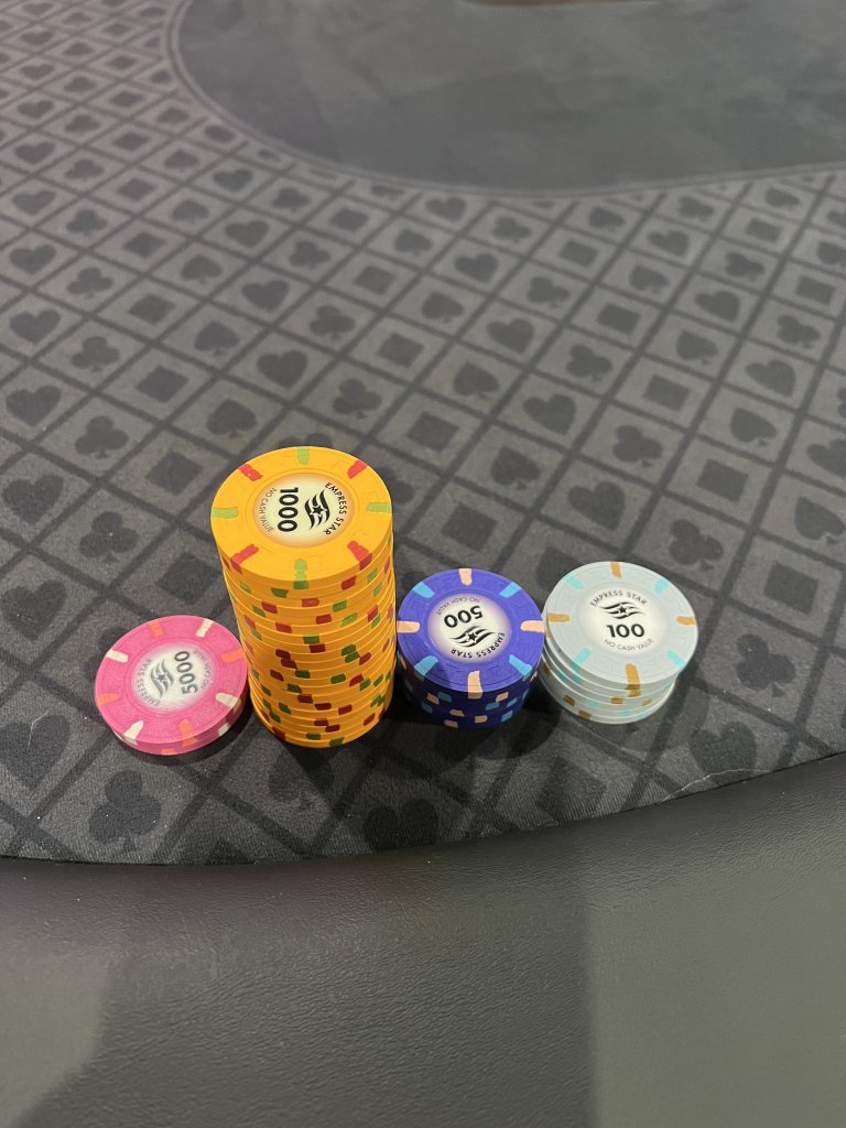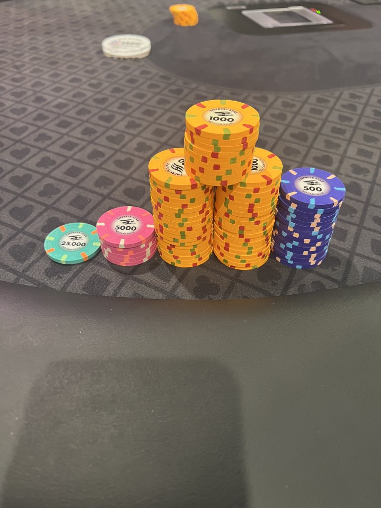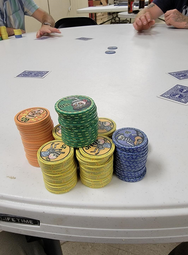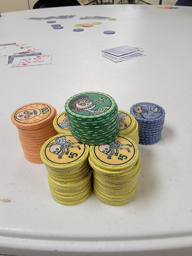 Player sitting across from Hero in the black jacket was tonight's big winner cashing out for $1575. Player to his left with the tall tower of greens lost most of his stack by evening's end. (See top pic.)