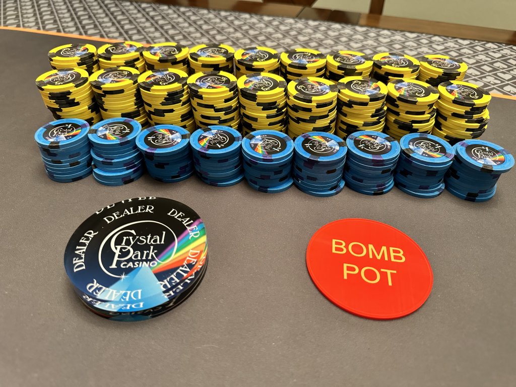 Thursday Night .25/.50 $100max NLHE w/ @jamesjkim, @triton, @SPR, @esapigao, @Godzilla28 & @Monaco. Sorry @JayBob I didn't get any close ups of the Tiger Palace Bomb Pot buttons but if you look close you'll see them! (I was busy dealing) Everyone got one at the start & another on each subsequent $100 Rebuy.