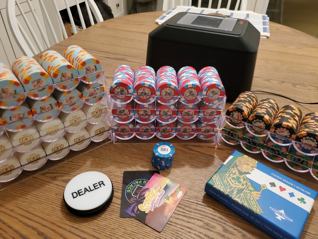 Ben has a custom set in the works. He had previously bought a bunch of barrels of different $1s to see what he liked. The IG $1s had been murdered and will be getting Gear labels as quarters in the future. We started the night using green $25 chips as quarters, but decided we preferred the whites for more color contrast, so we switched out. It was poker and it was fun, and that's all the counts!